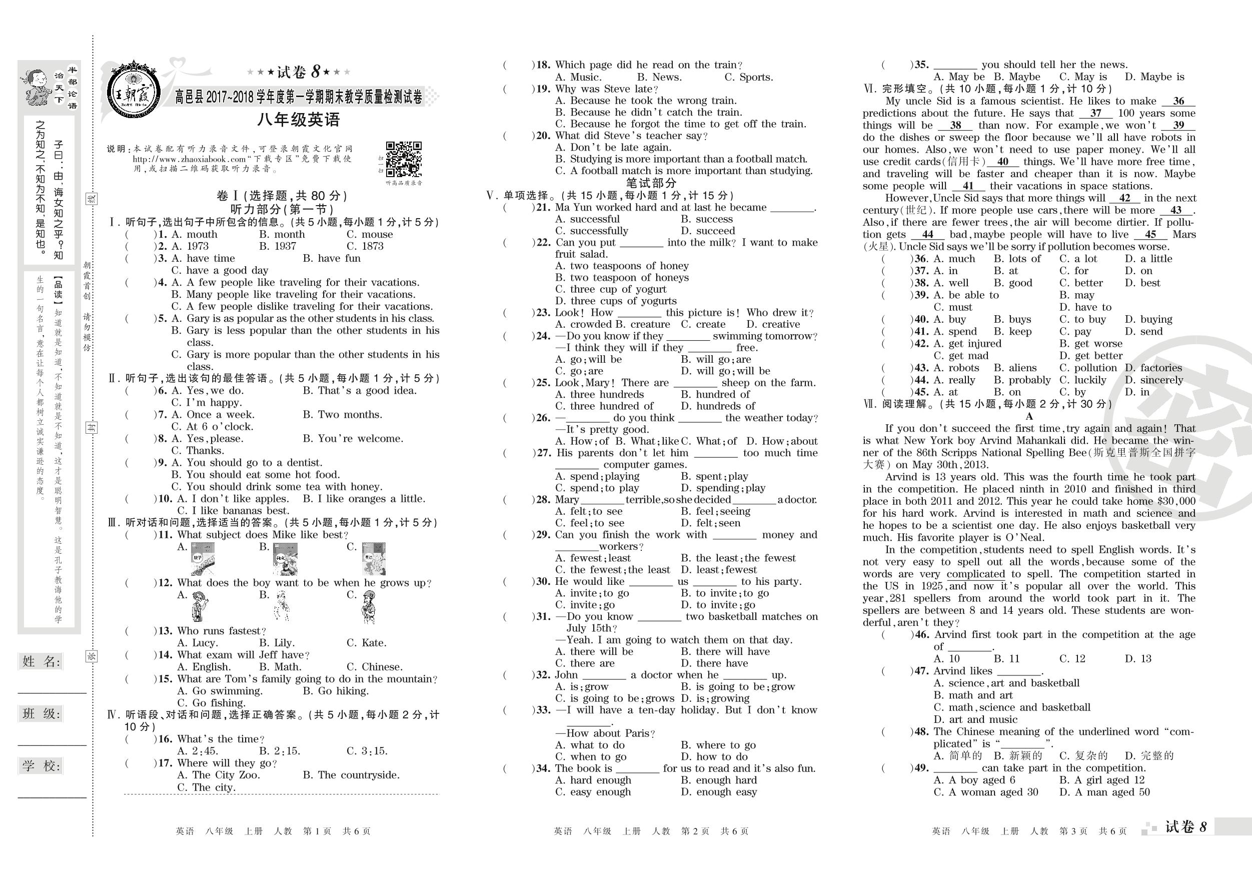 2017-2018学年第一学期石家庄市高邑县八年级英语试卷(人教版)【8】