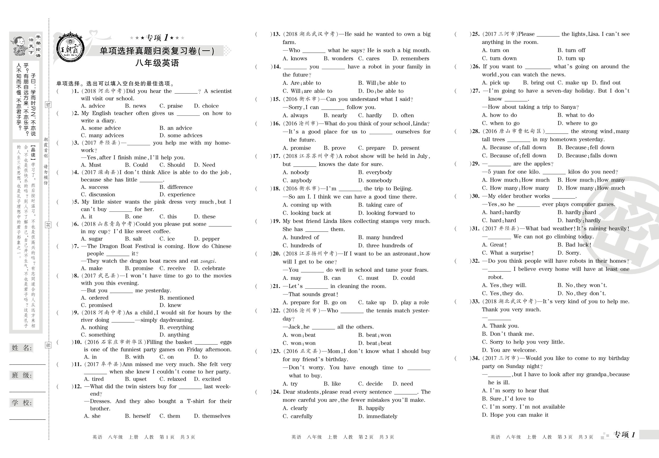 王朝霞期末专项卷——单项选择(一)(二)真题归类复习卷八年级上册英语(人教版)_R210809130507【0】