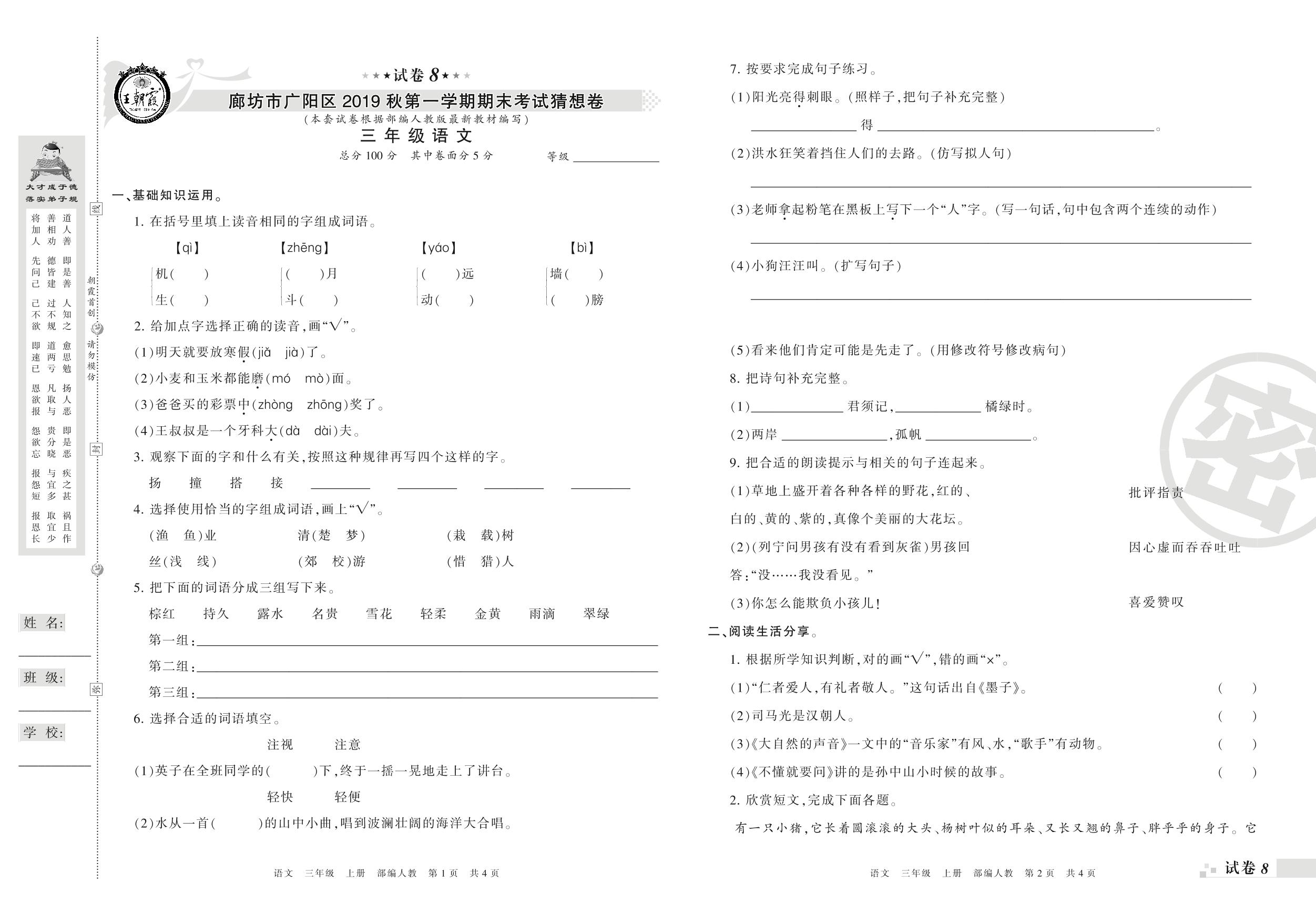 2018-2019学年第一学期廊坊市广阳区猜想卷三年级语文试卷(人教版)【8】