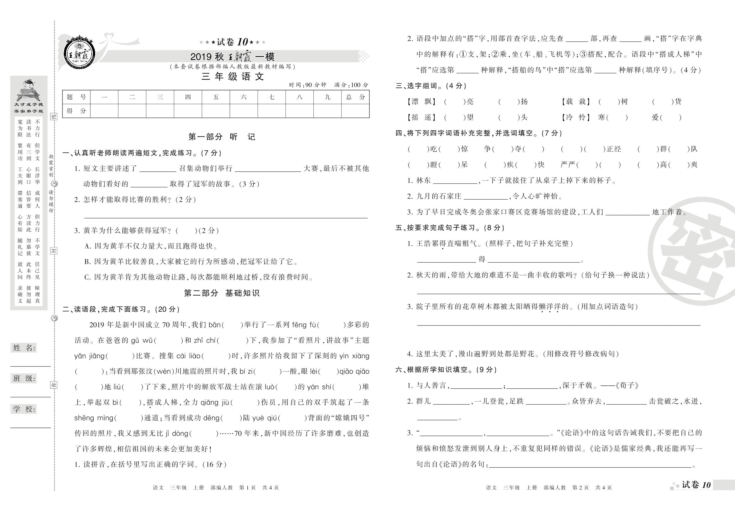 王朝霞期末模拟卷三年级上册语文(人教版)_R21080191921【10】