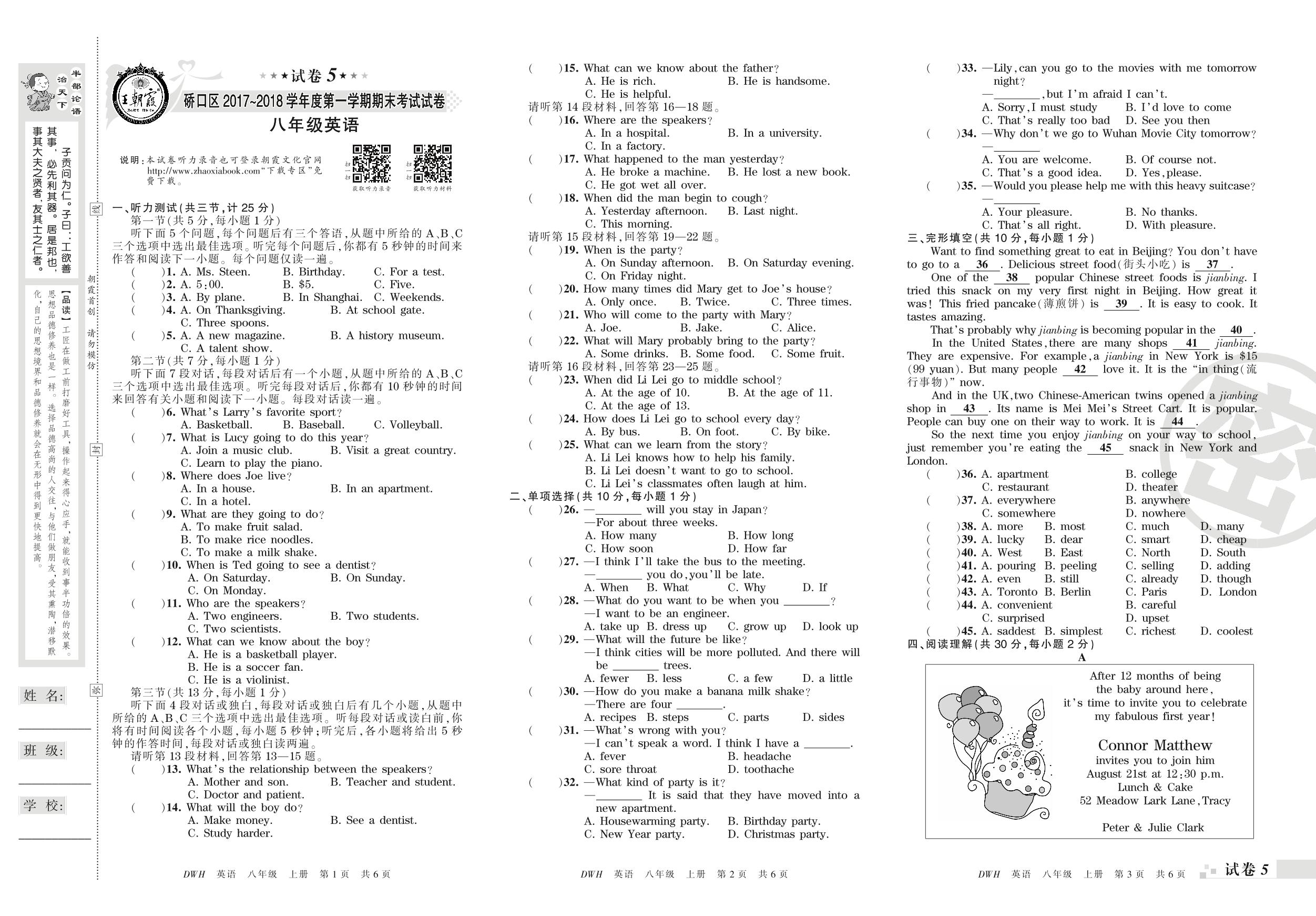 2017-2018学年第一学期武汉市硚口区八年级英语试卷(人教版)【5】