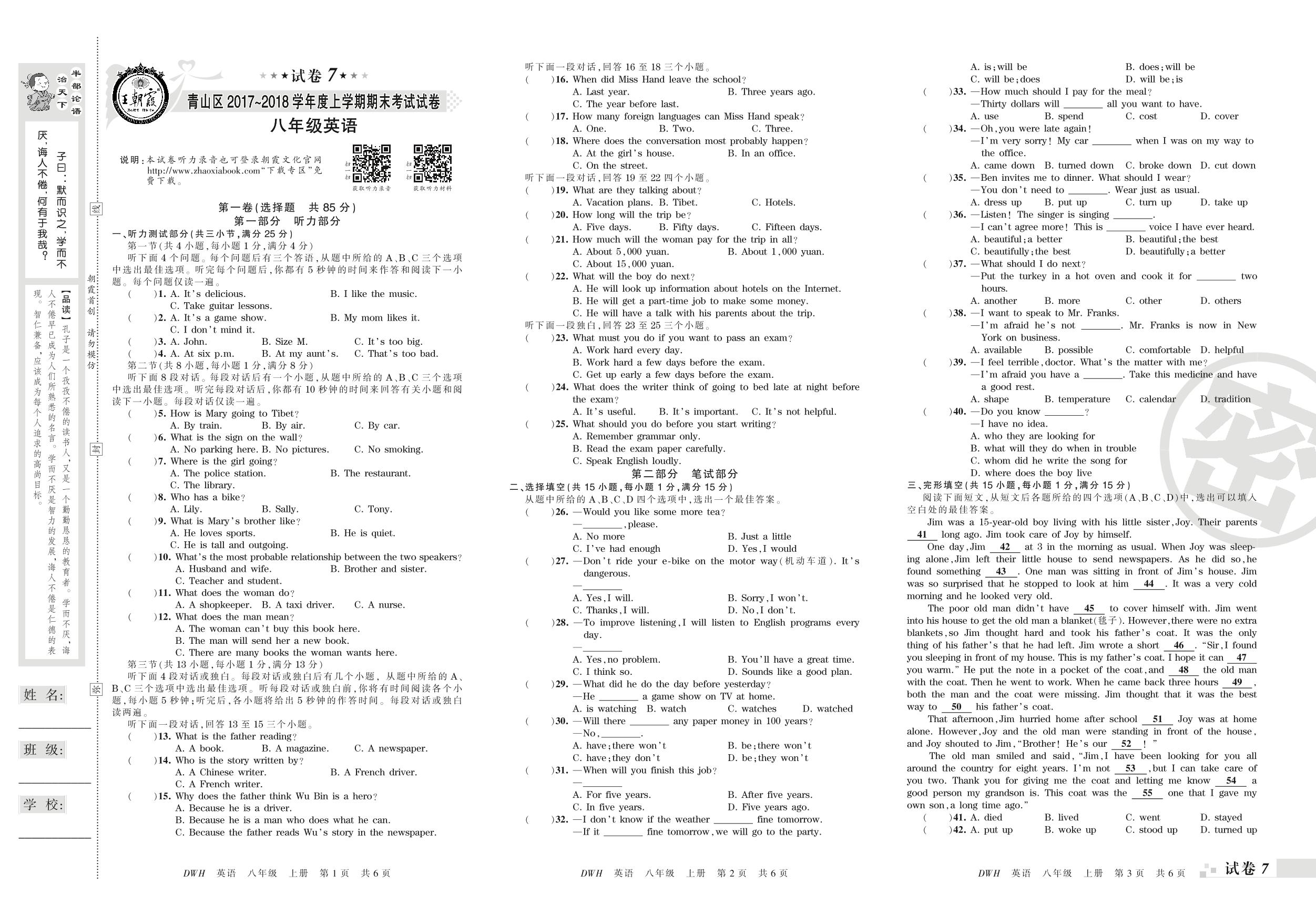 2017-2018学年第一学期武汉市青山区八年级英语试卷(人教版)【7】