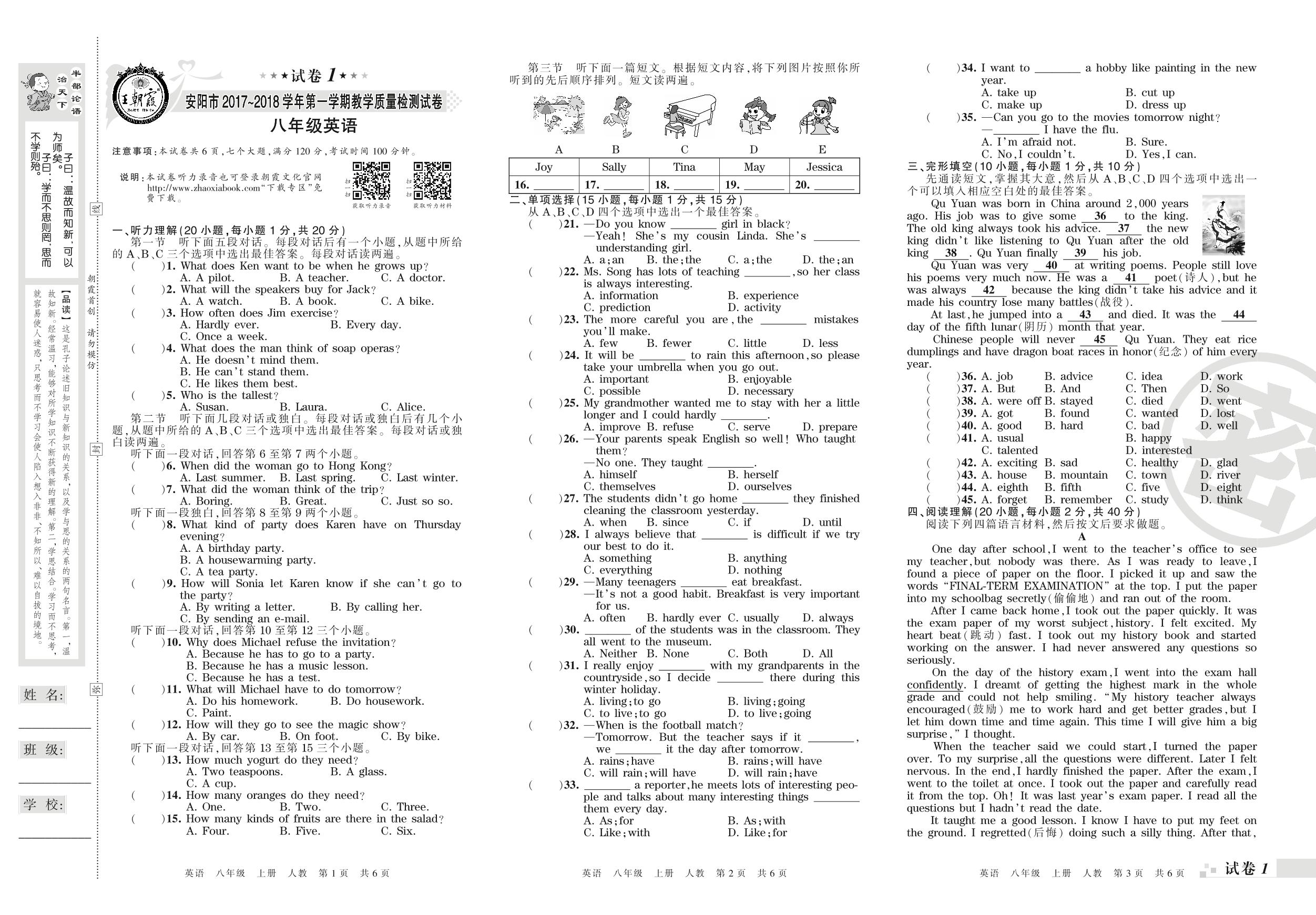 2017-2018学年第一学期安阳市八年级英语试卷(人教版)【1】