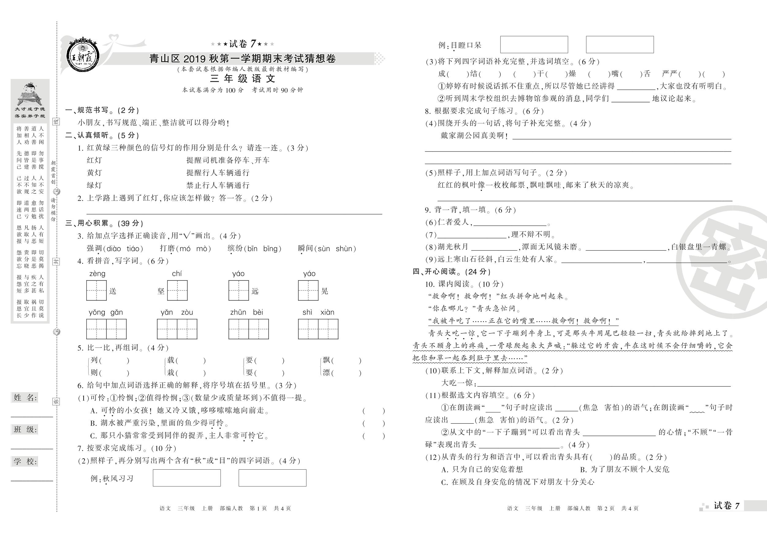 2018-2019学年第一学期武汉市青山区猜想卷三年级语文试卷(人教版)【7】