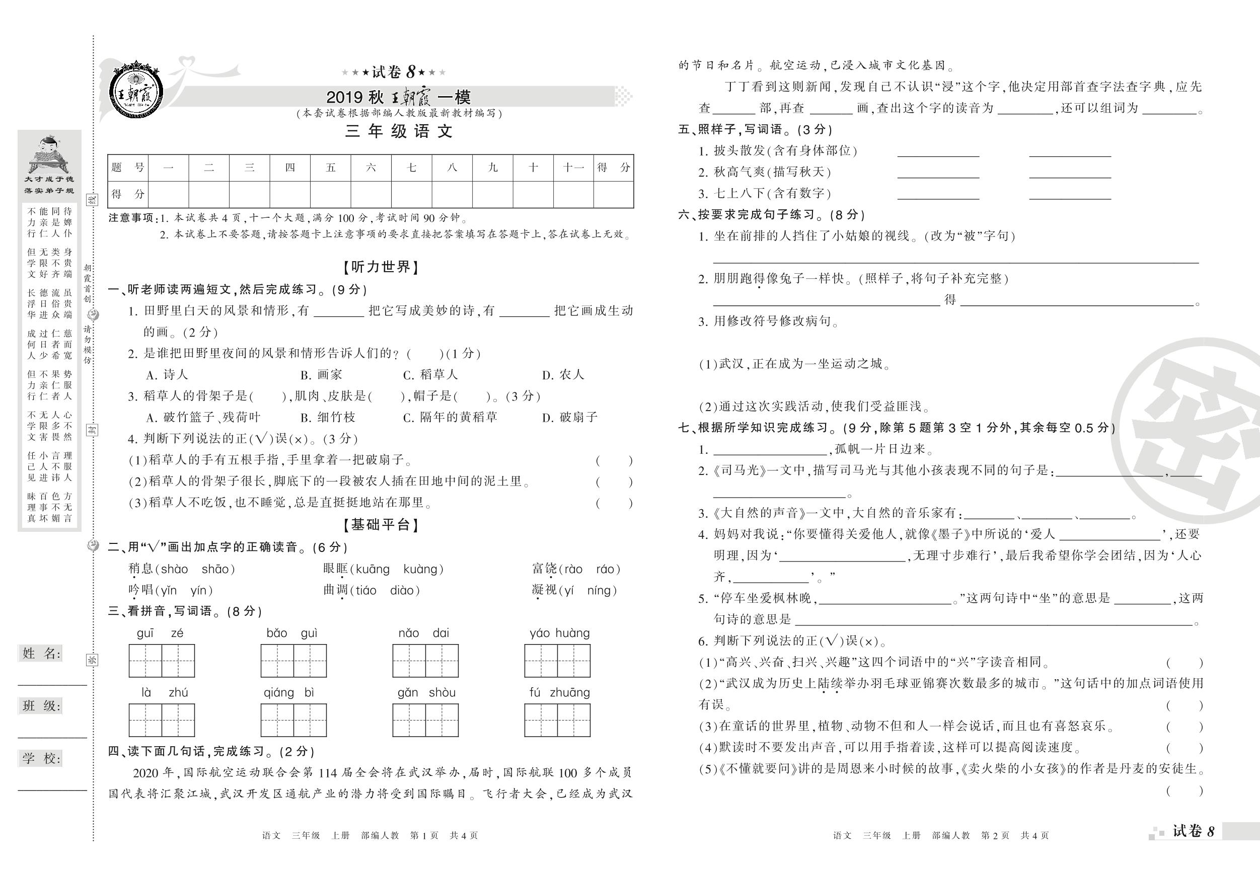 王朝霞期末模拟卷三年级上册语文(人教版)_R21080191931【8】