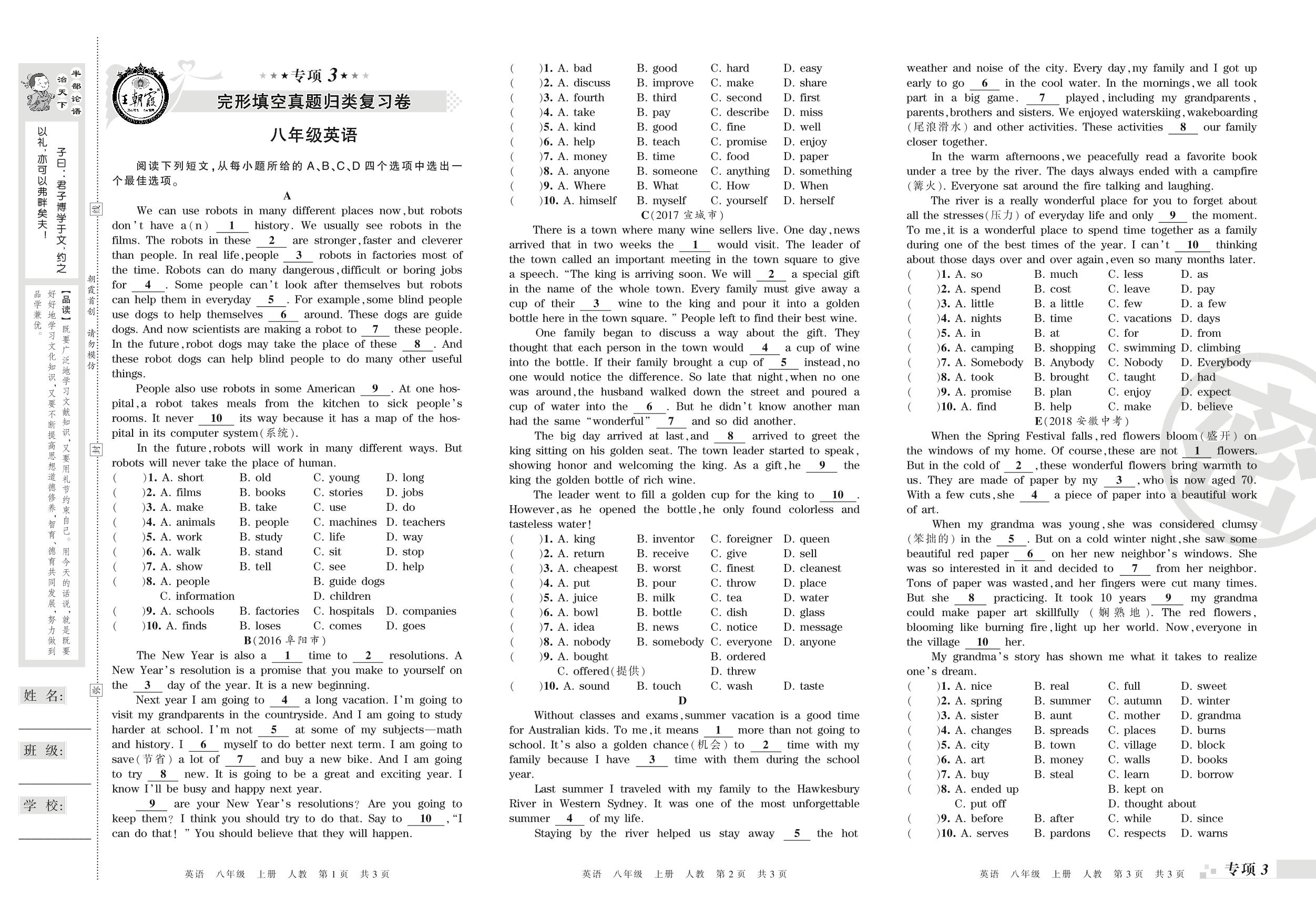 王朝霞期末专项卷——完形填空、任务型阅读真题归类复习卷八年级上册英语(人教版)_R210809131746【0】