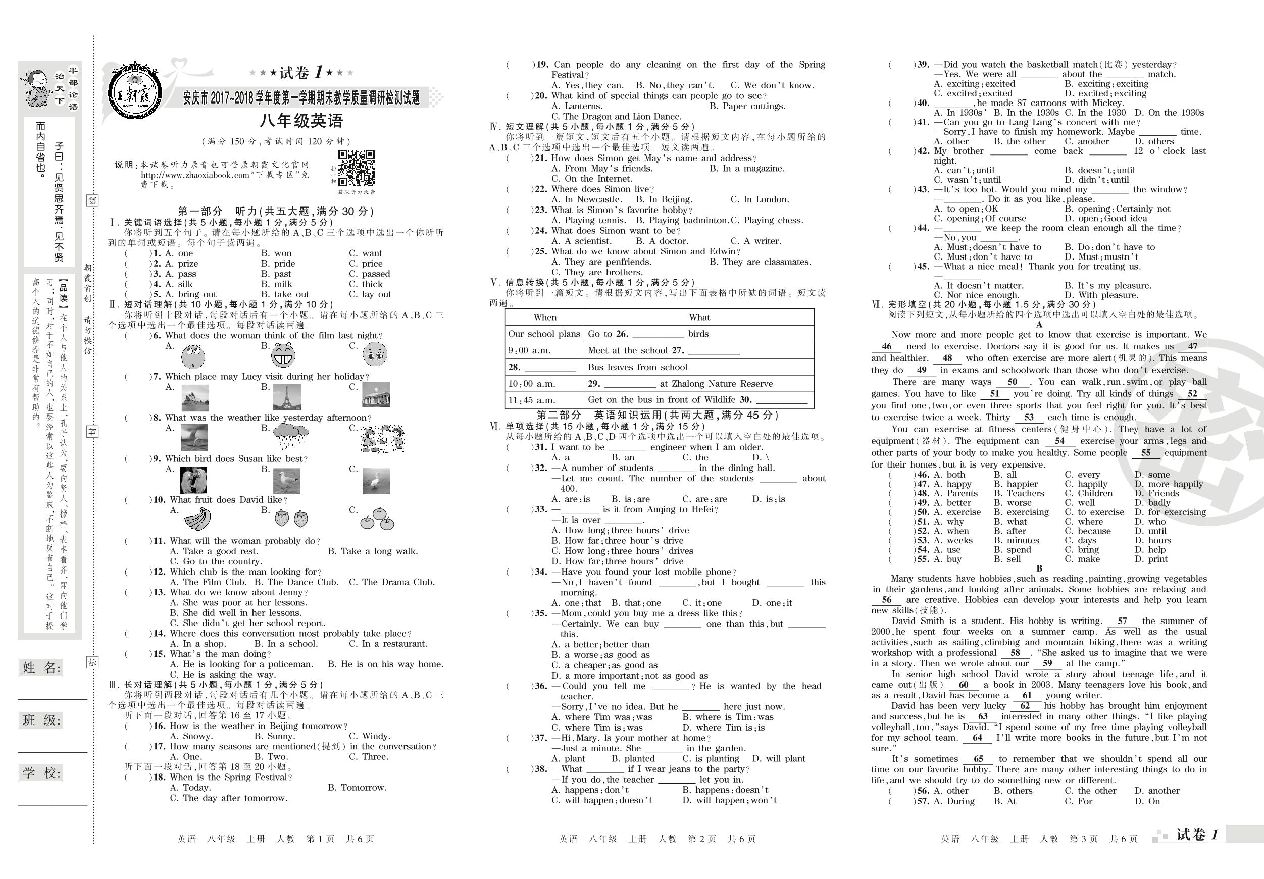 2017-2018学年第一学期安庆市八年级英语试卷(人教版)【1】