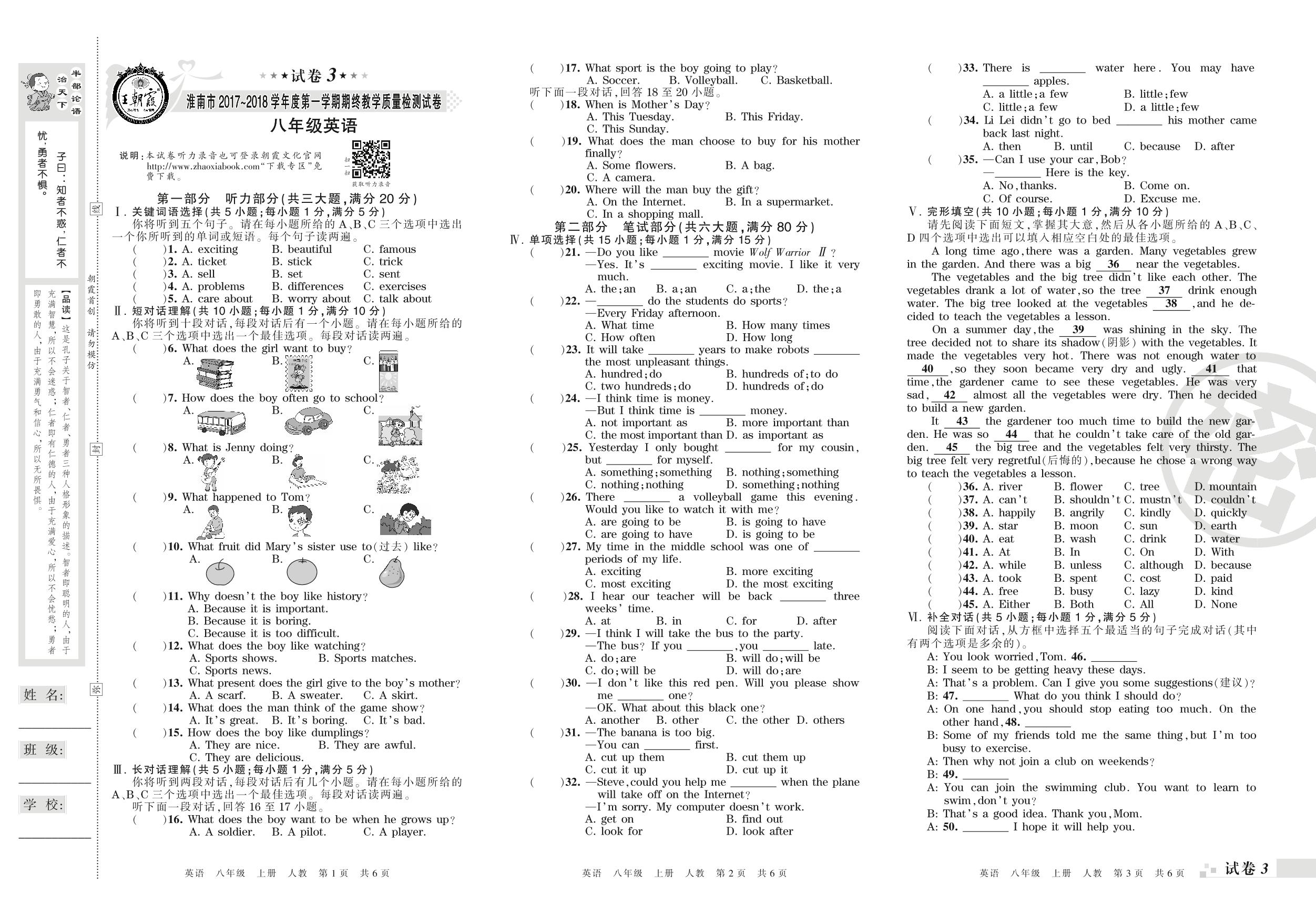 2017-2018学年第一学期淮南市八年级英语试卷(人教版)【3】