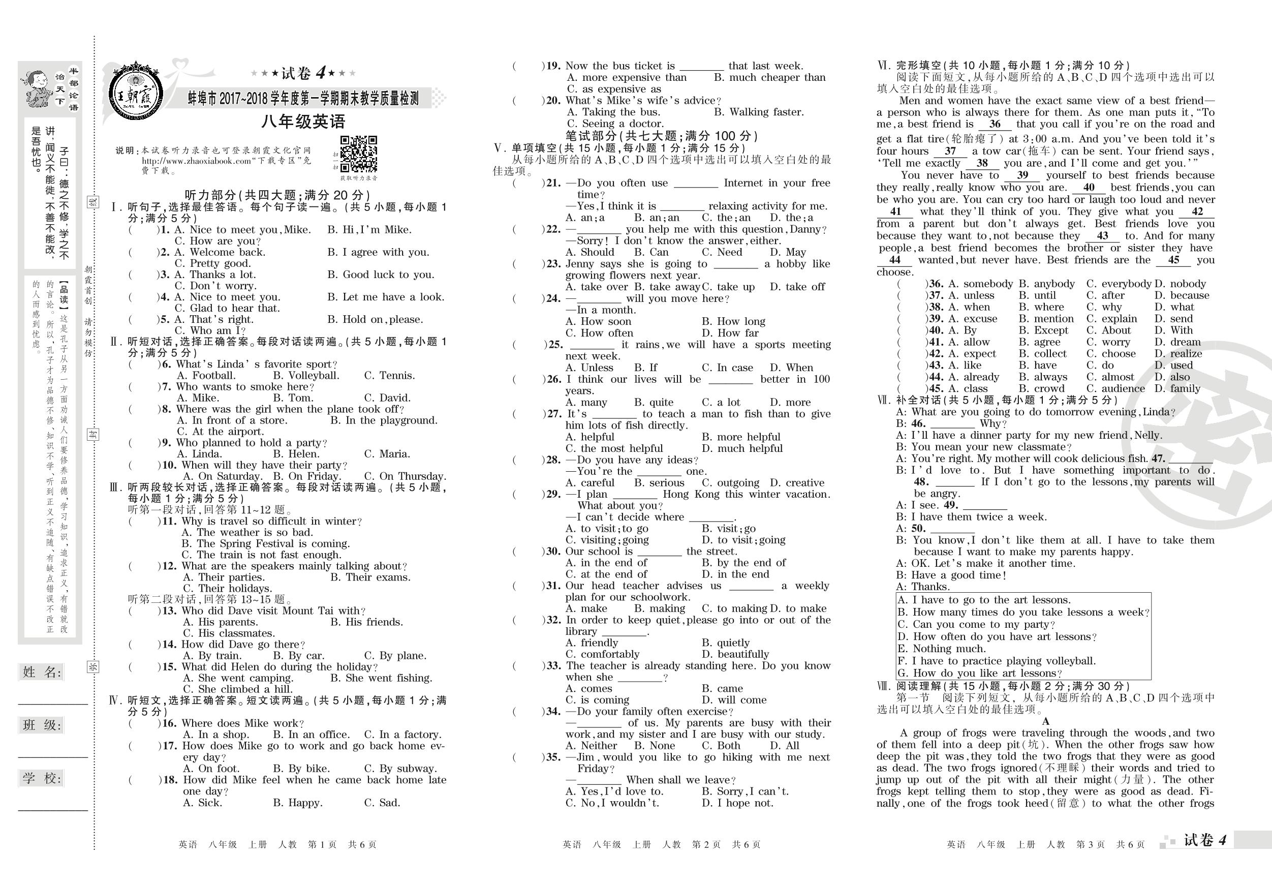 2017-2018学年第一学期蚌埠市八年级英语试卷(人教版)【4】