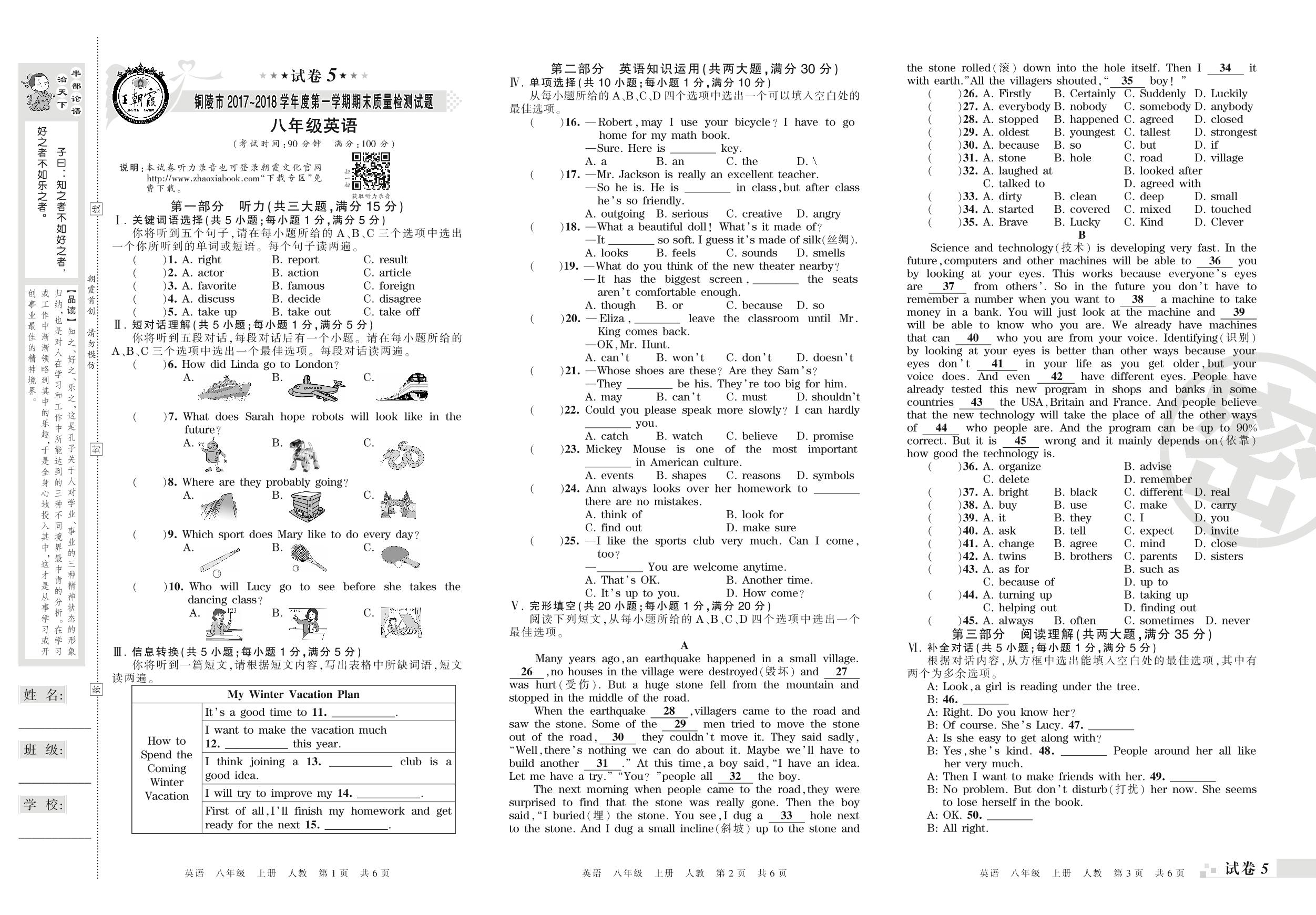 2017-2018学年第一学期铜陵市八年级英语试卷(人教版)【5】