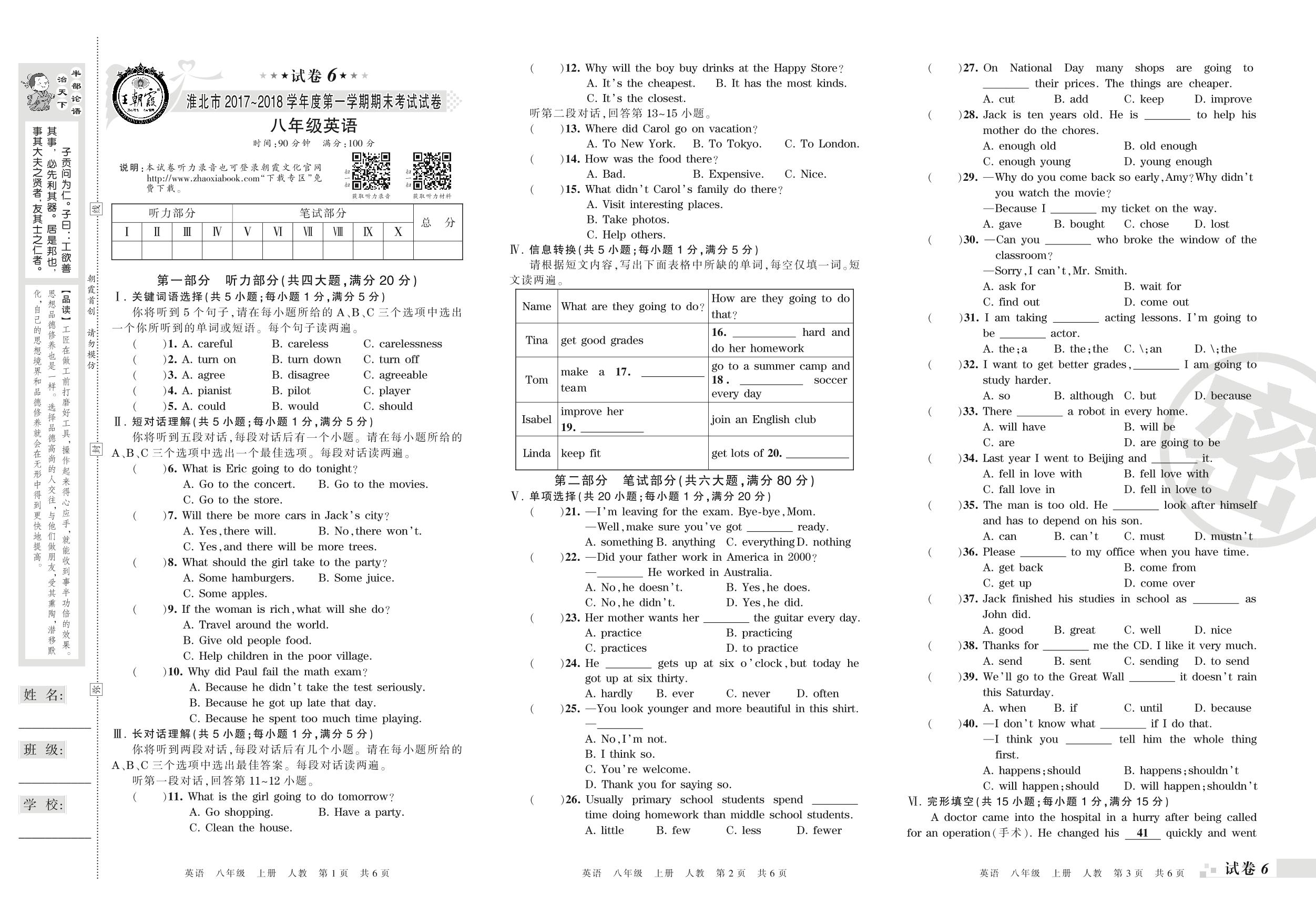 2017-2018学年第一学期淮北市八年级英语试卷(人教版)【6】