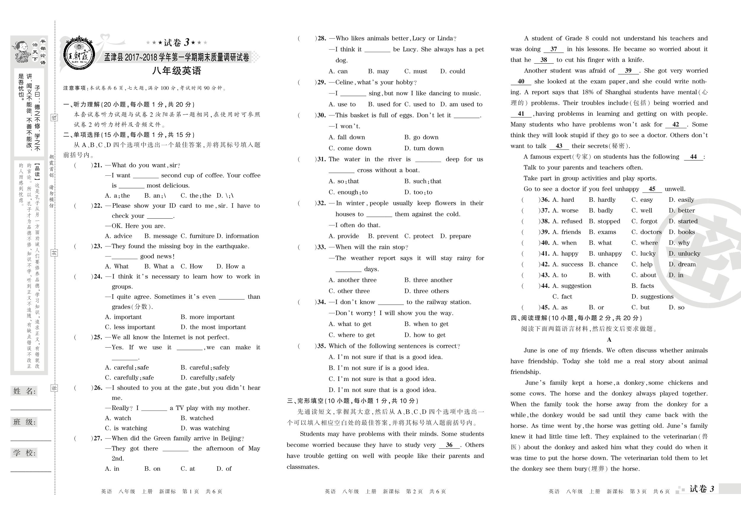 2017-2018学年第一学期洛阳市孟津县八年级英语试卷(新课版)【3】