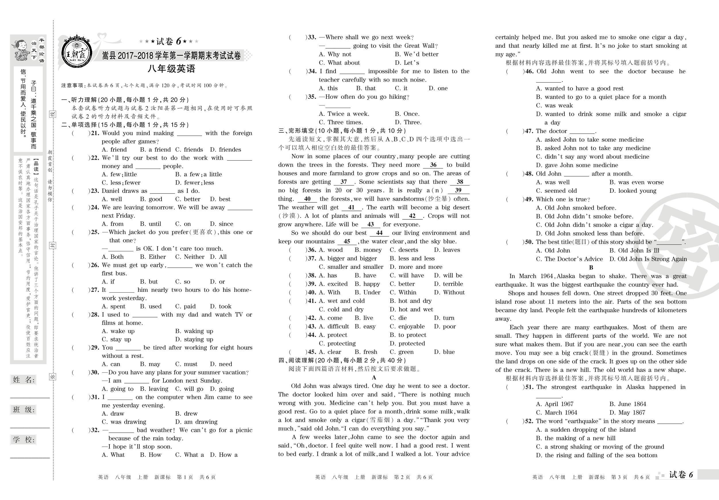 2017-2018学年第一学期洛阳市嵩县八年级英语试卷(新课版)【6】