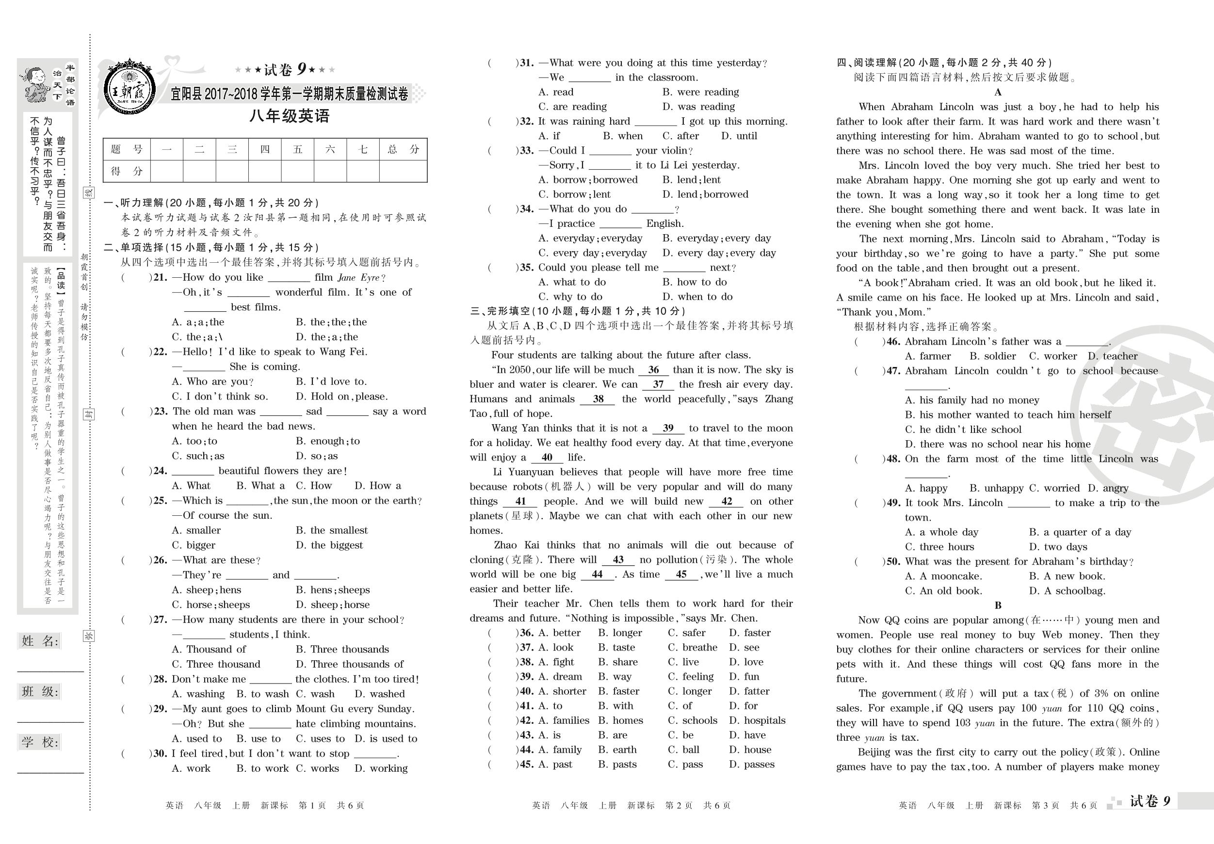 2017-2018学年第一学期洛阳市宜阳县八年级英语试卷(新课版)【9】