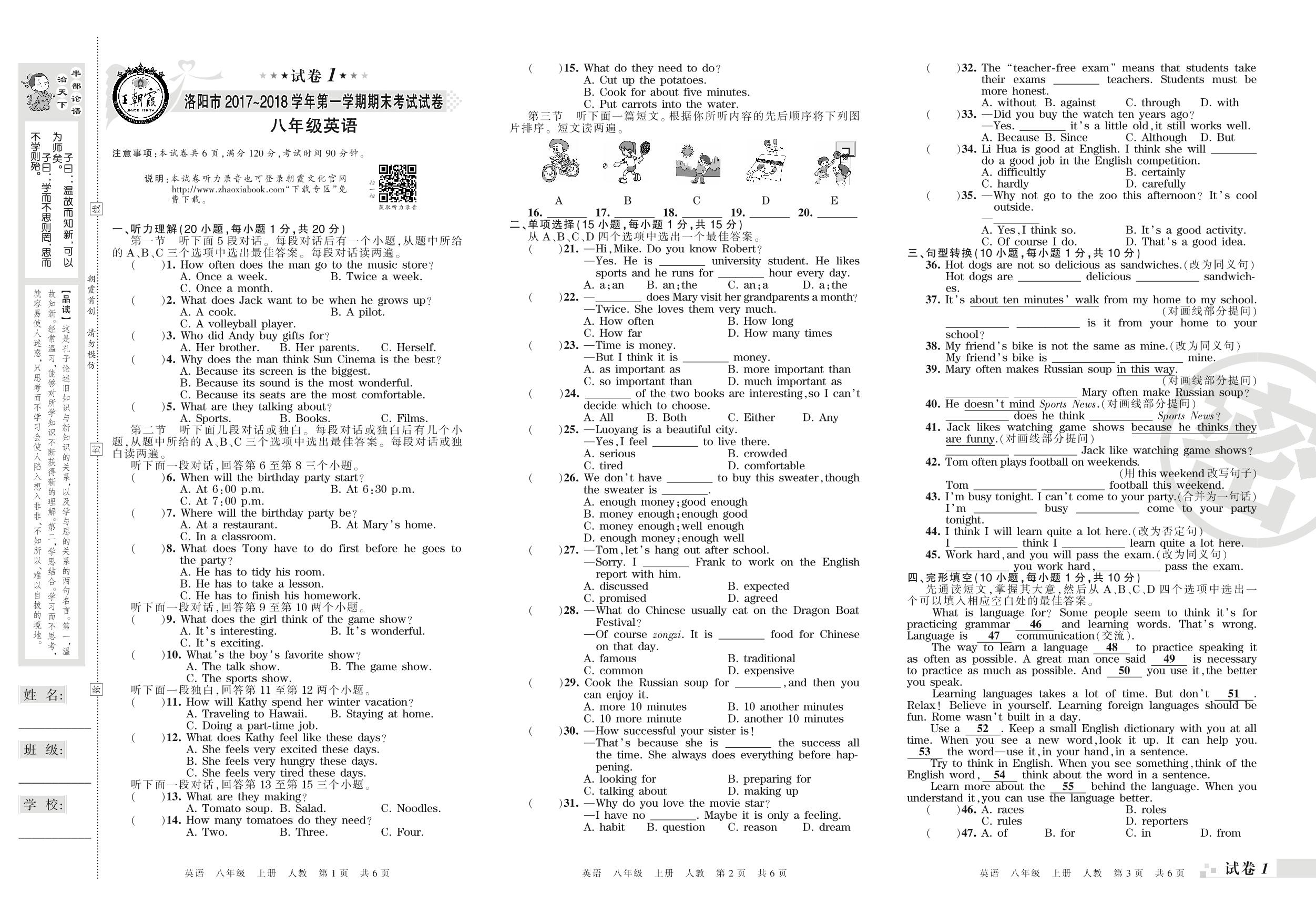 2017-2018学年第一学期洛阳市八年级英语试卷(人教版)【1】
