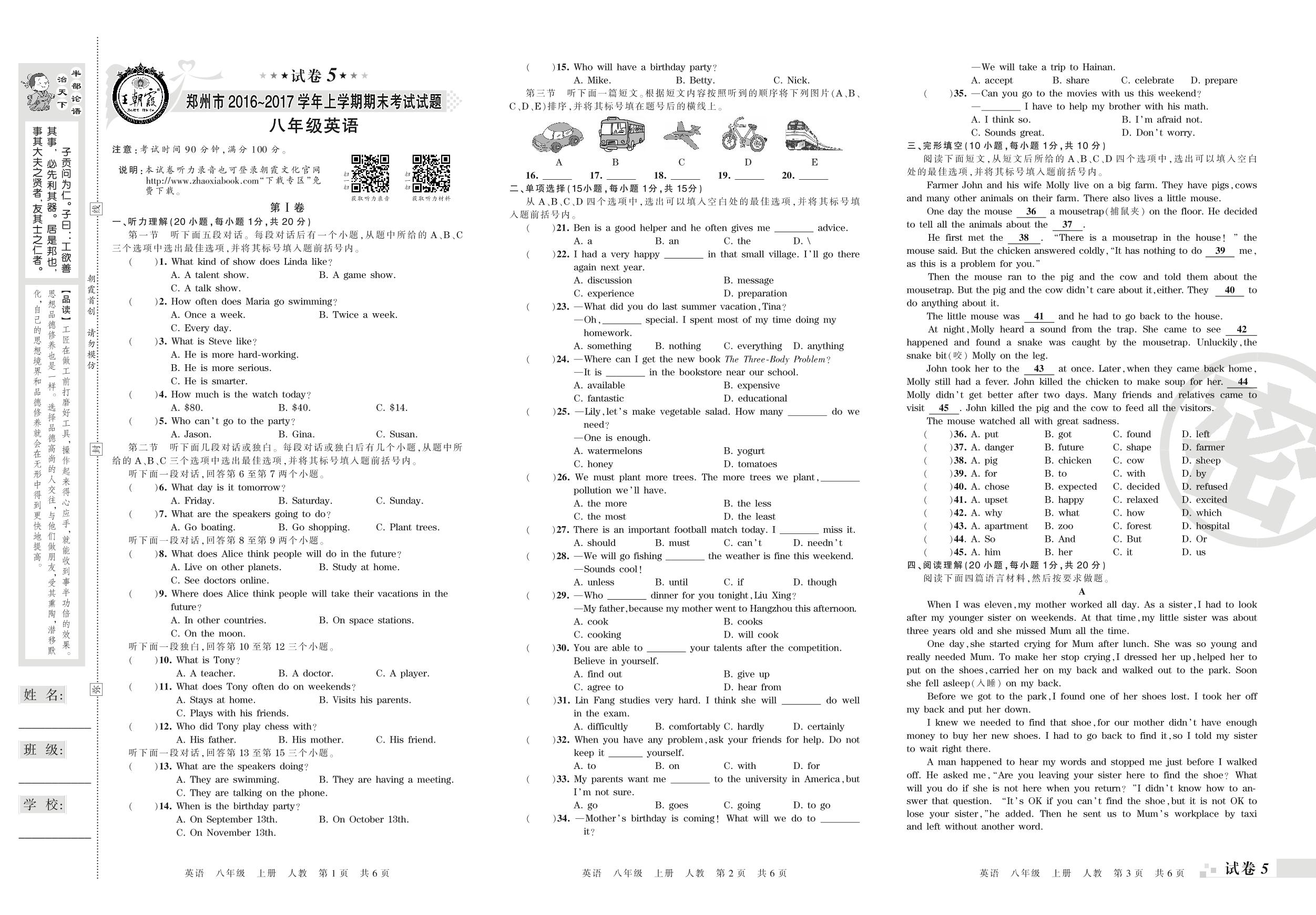 2016-2017学年第一学期郑州市八年级英语试卷(人教版)_R210809132203【5】