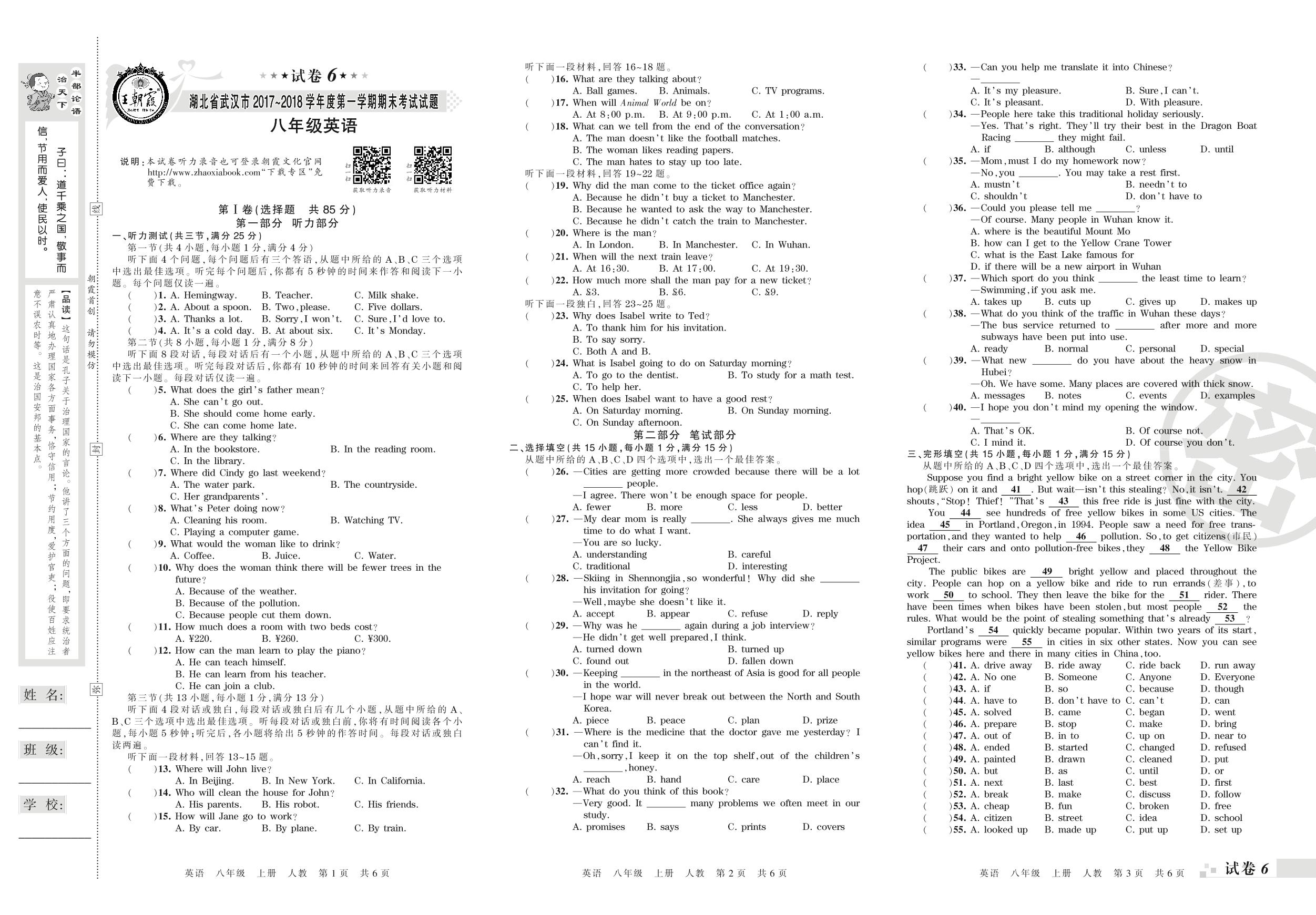 2017-2018学年第一学期湖北省武汉市八年级英语试卷(人教版)【6】