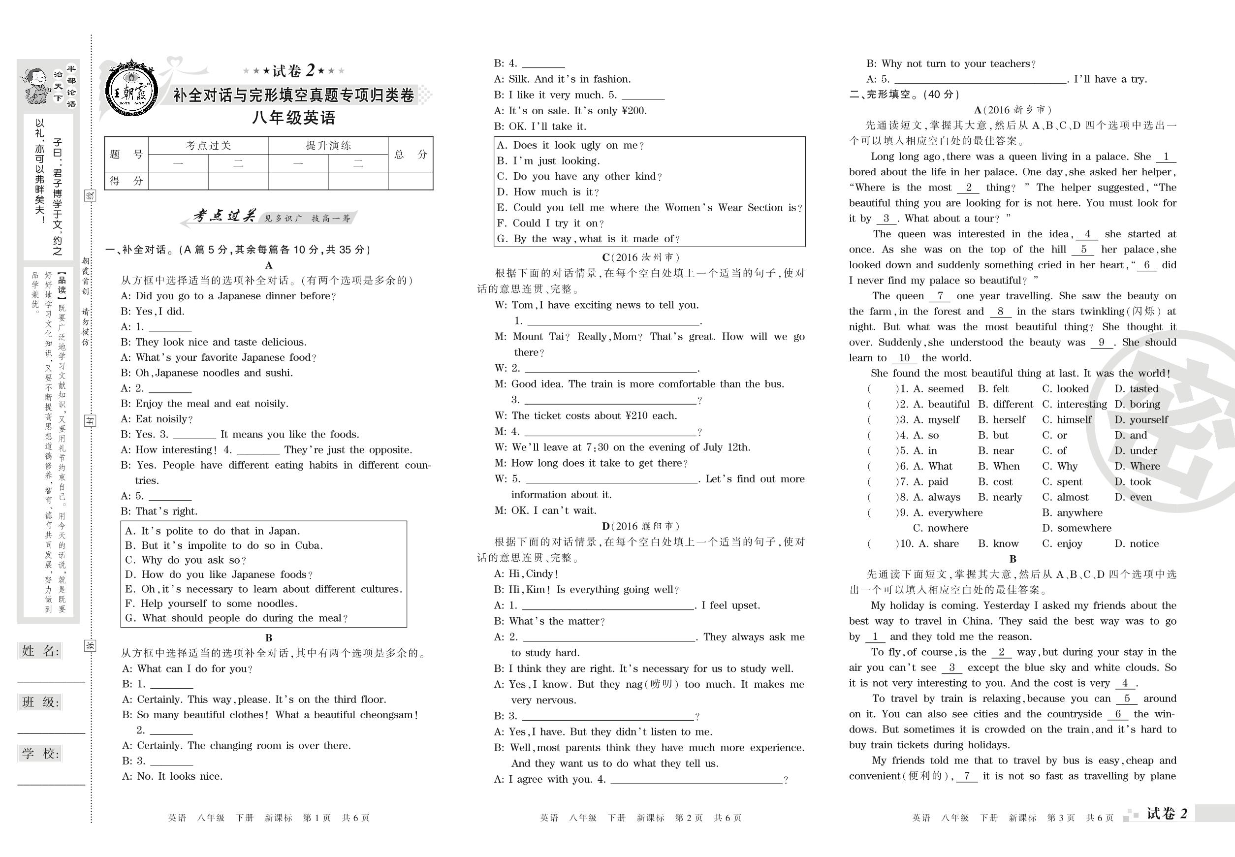 王朝霞期末专项卷——补全对话与完形填空真题专项归类卷八年级下册英语(新课版)_R210809132426【2】