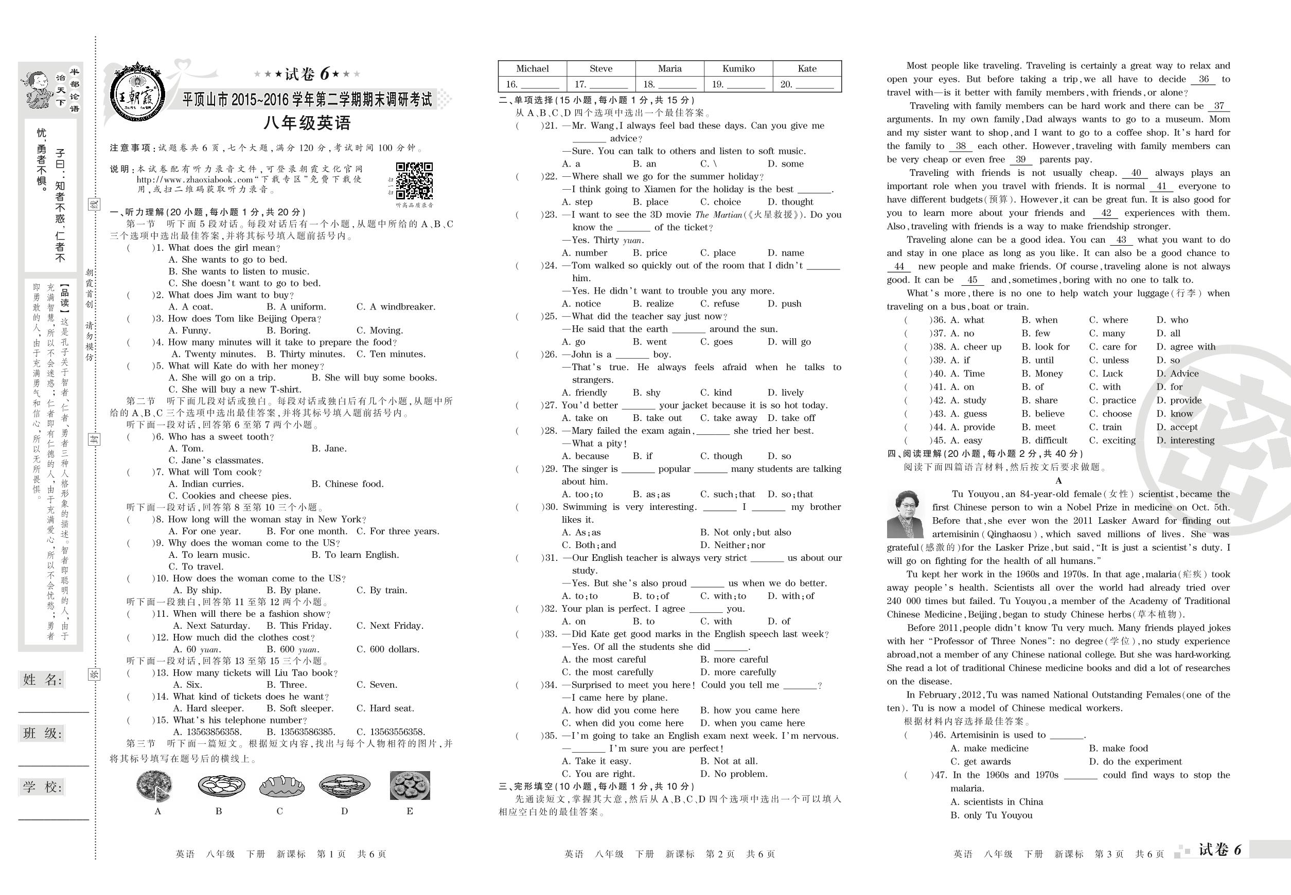 2015-2016学年第二学期平顶山市八年级英语试卷(新课版)【6】
