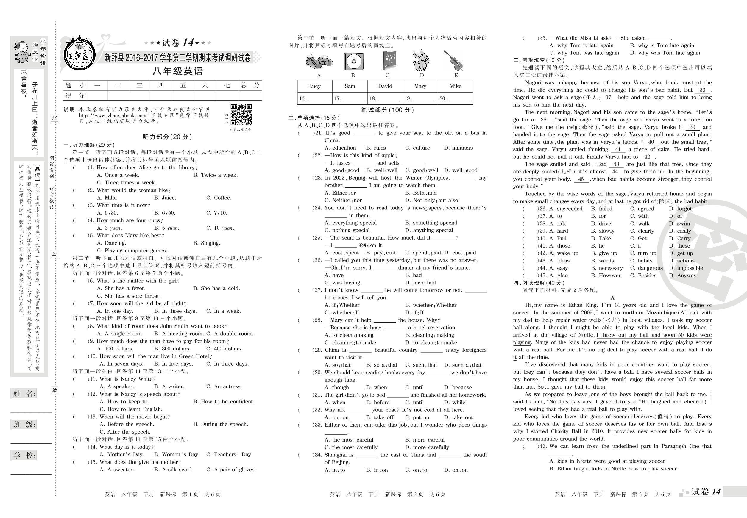 2016-2017学年第二学期南阳市新野县八年级英语试卷(新课版)【14】