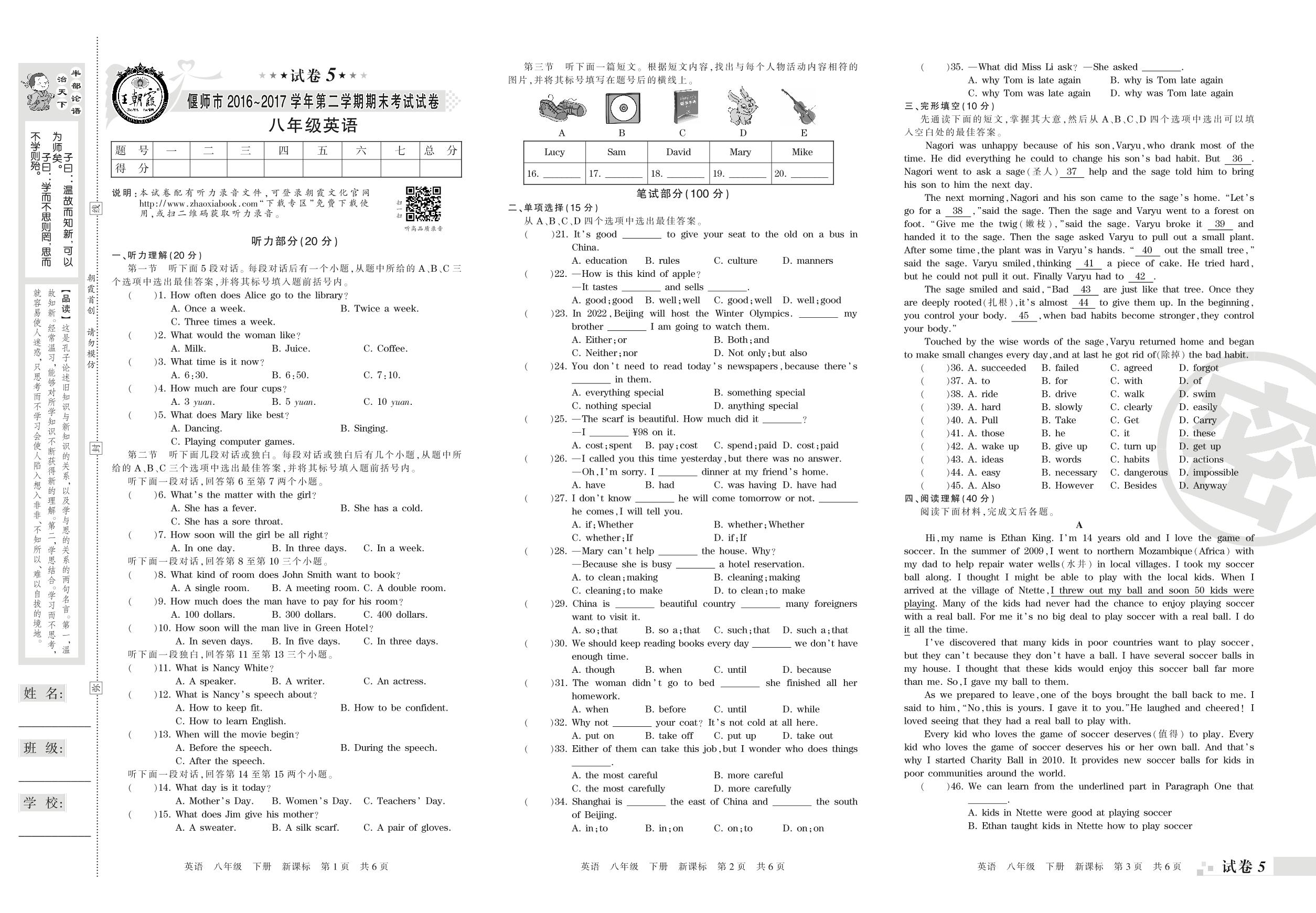 2016-2017学年第二学期偃师市八年级英语试卷(新课版)【5】