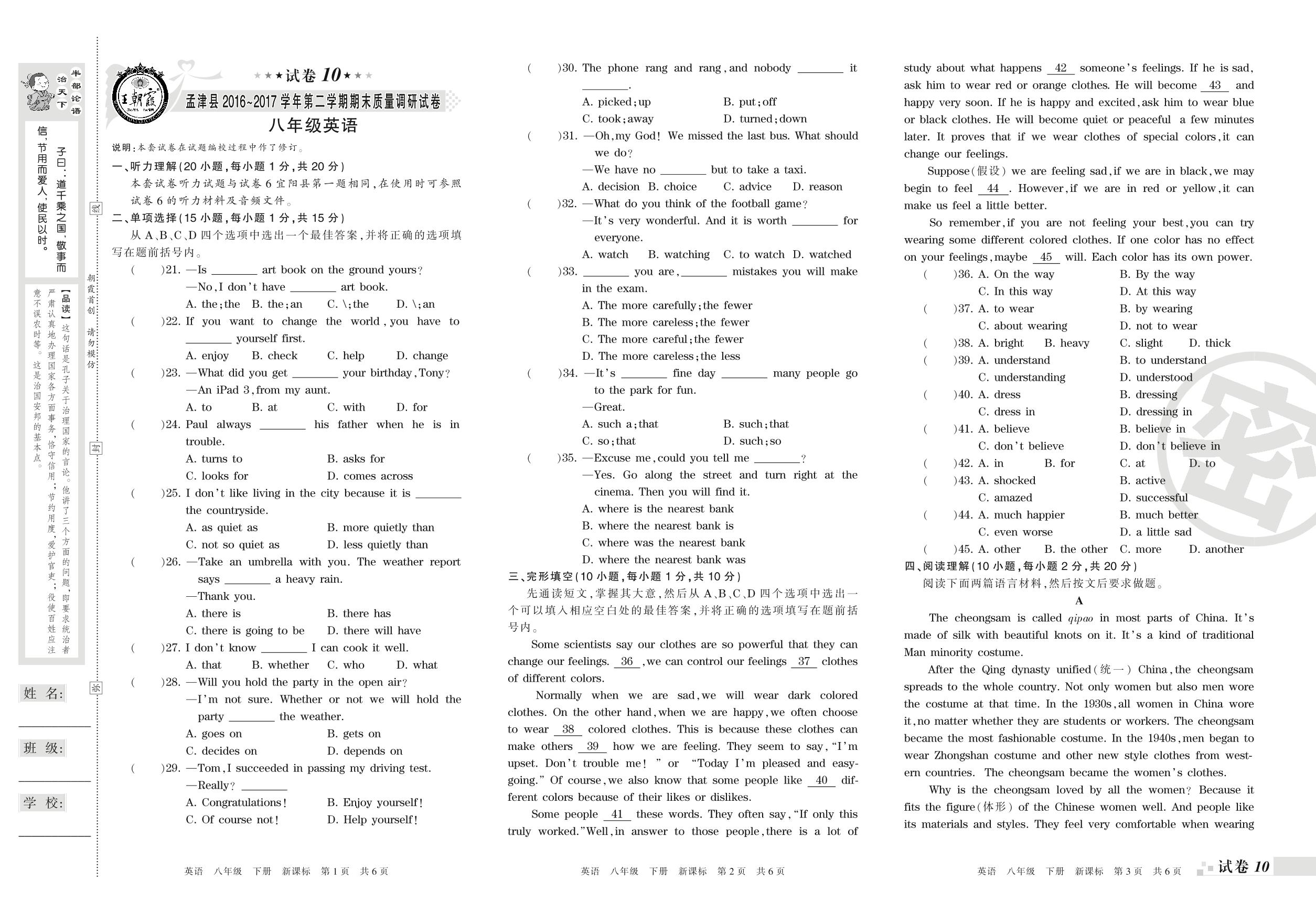 2016-2017学年第二学期洛阳市孟津县八年级英语试卷(新课版)【10】