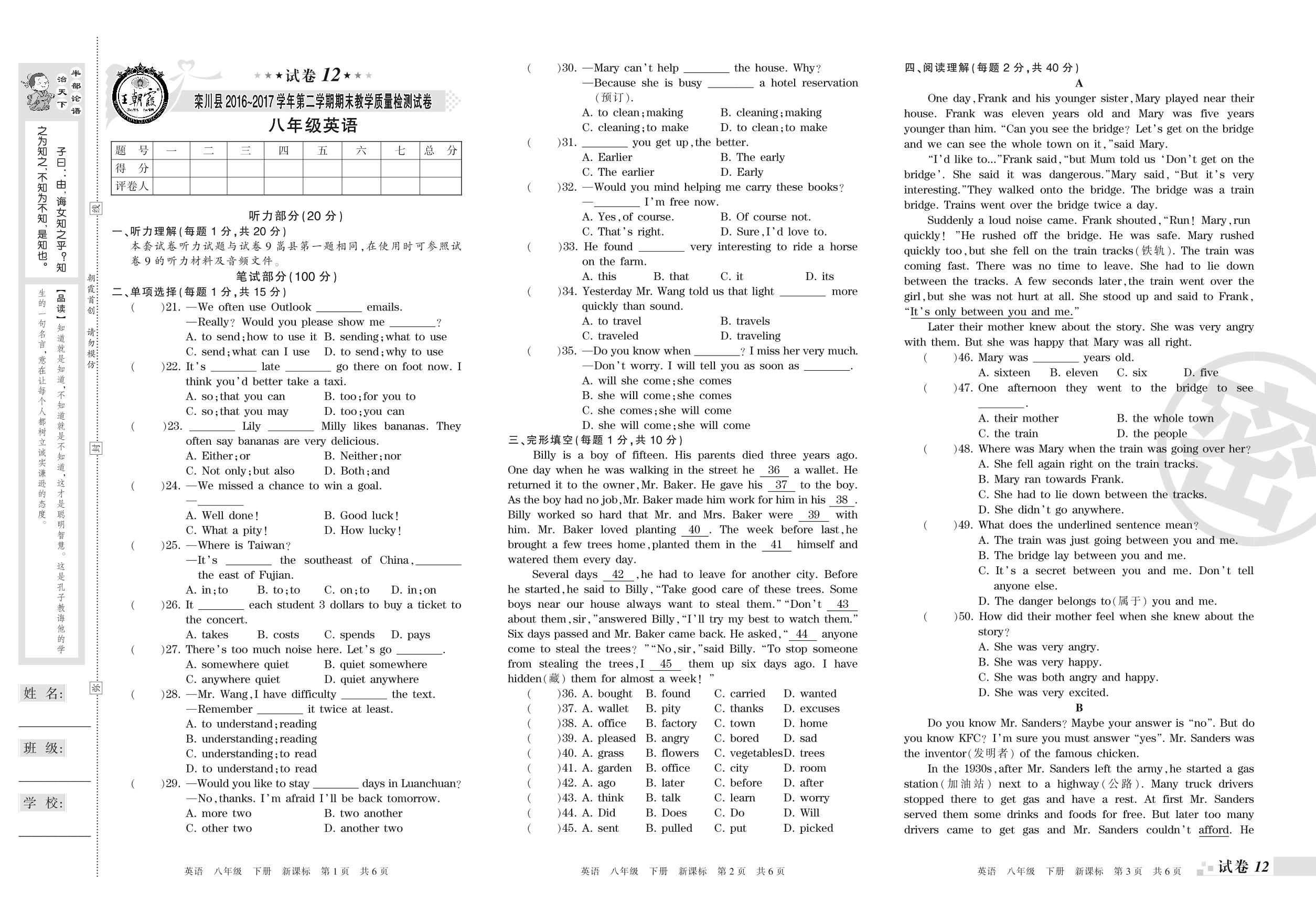 2016-2017学年第二学期洛阳市栾川县八年级英语试卷(新课版)【12】