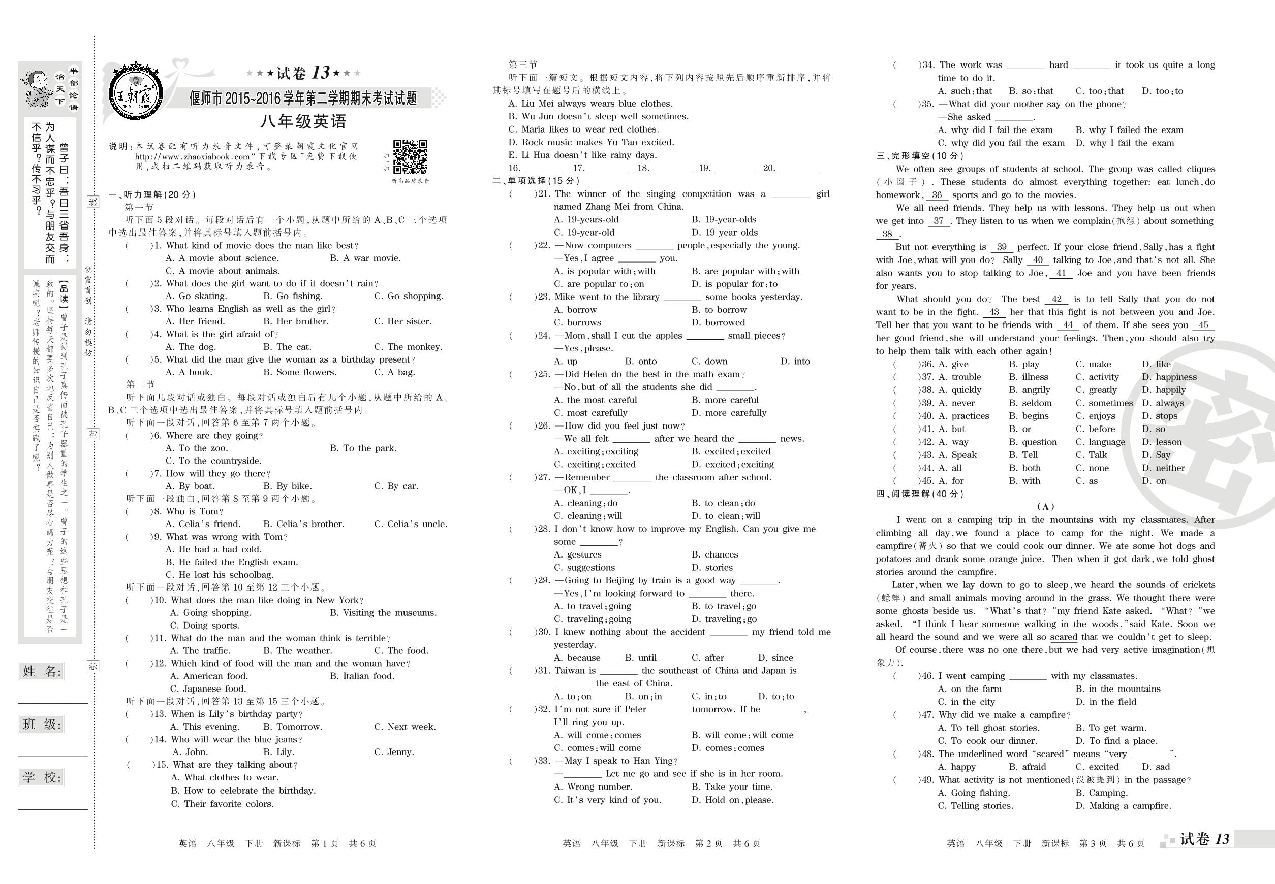 2015-2016学年第二学期偃师市八年级英语试卷(新课版)【13】