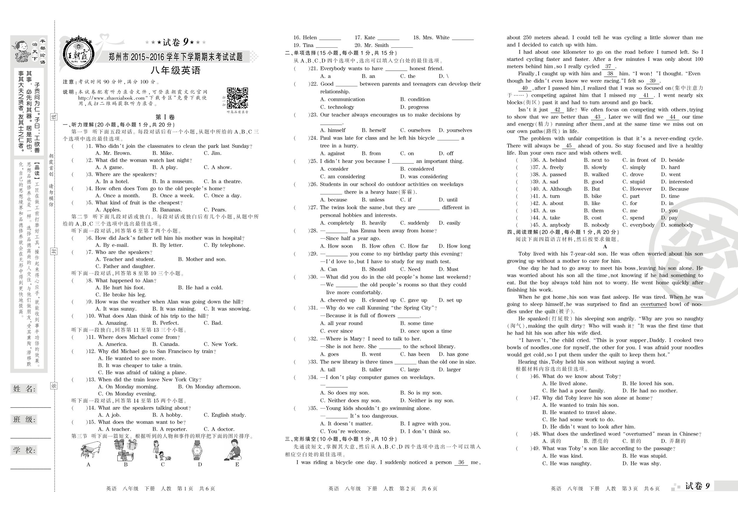 2015-2016学年第二学期郑州市八年级英语试卷(人教版)【9】