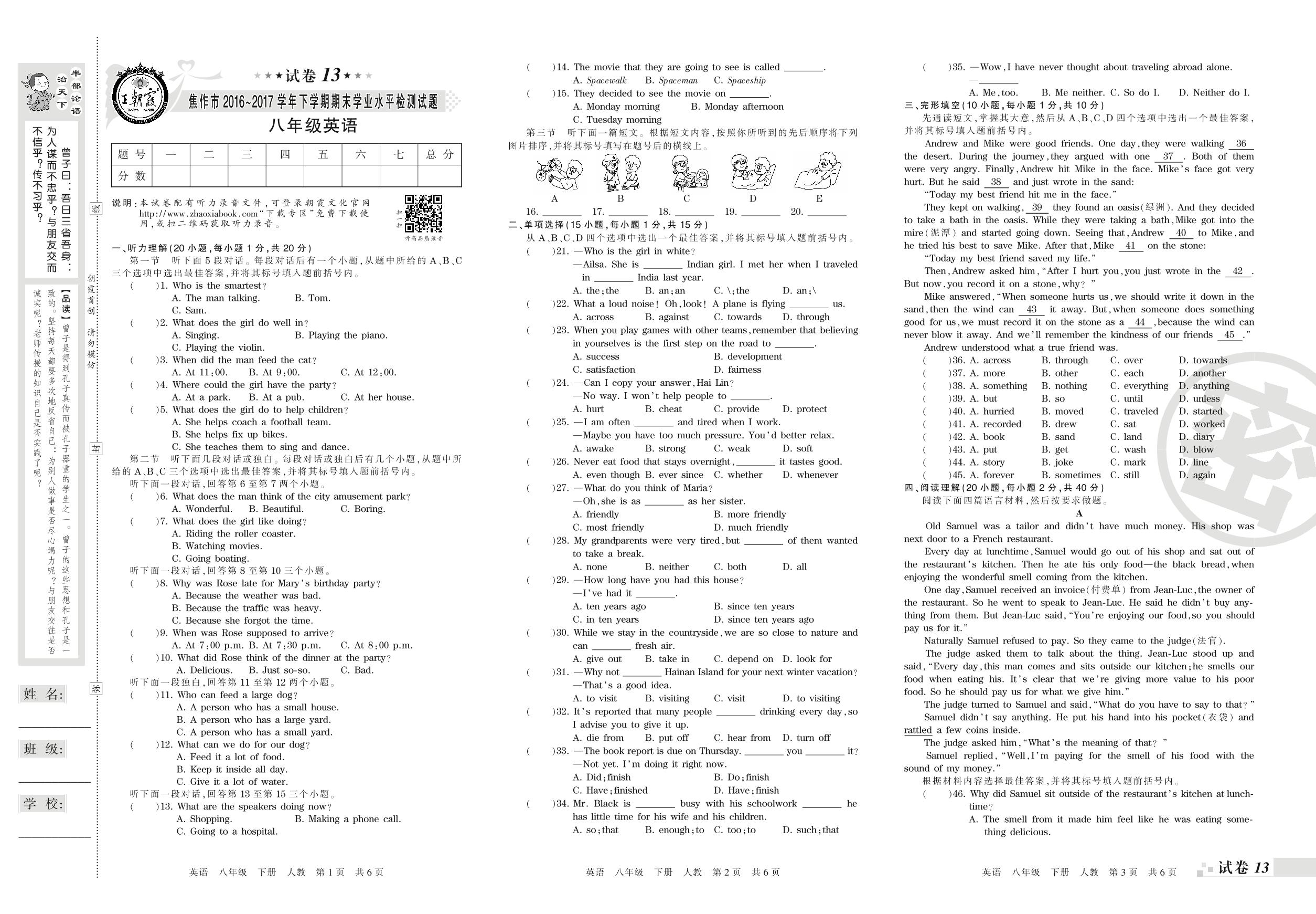 2016-2017学年第二学期焦作市八年级英语试卷(人教版)【13】