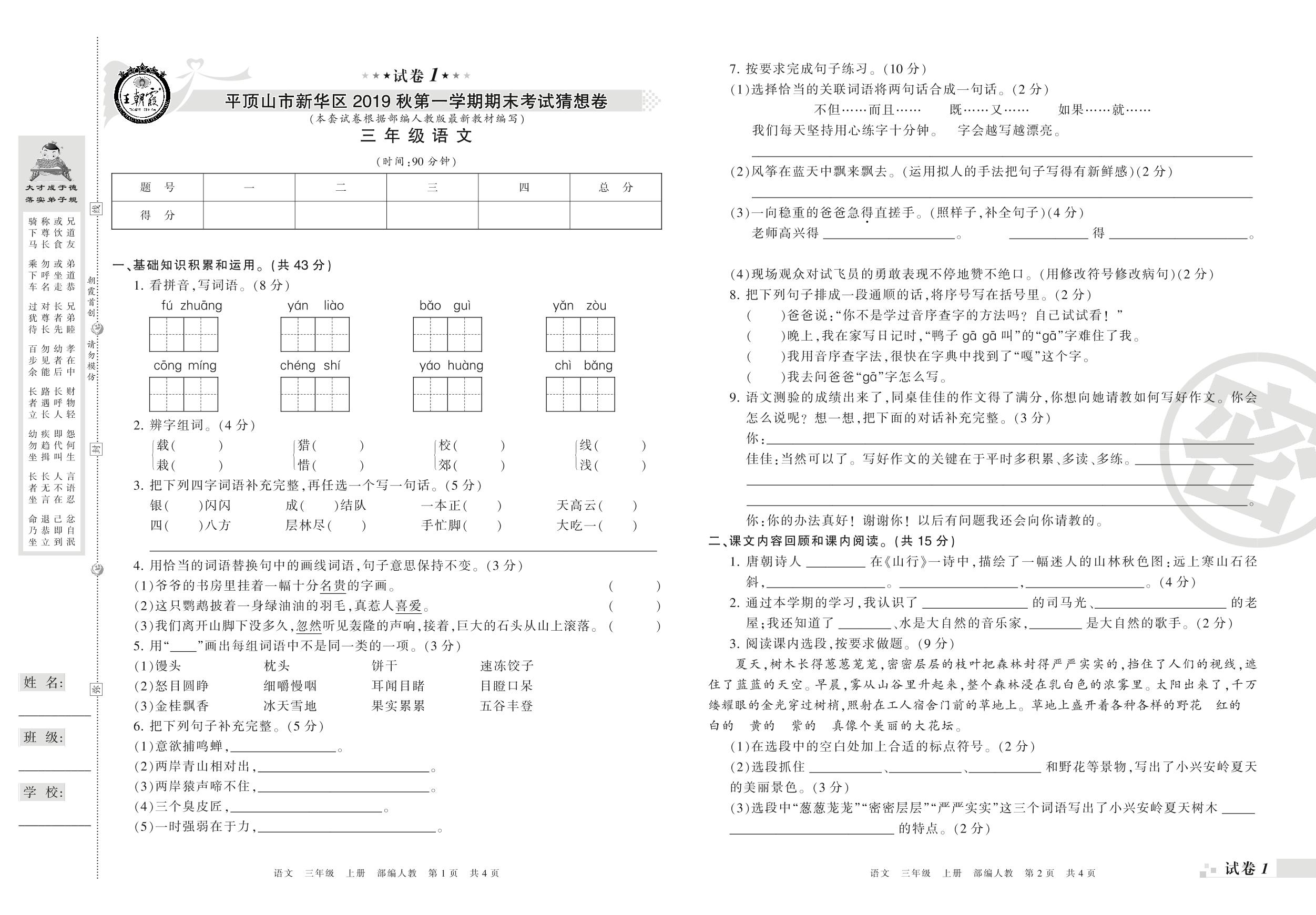 2018-2019学年第一学期平顶山市新华区猜想卷三年级语文试卷(人教版)【1】