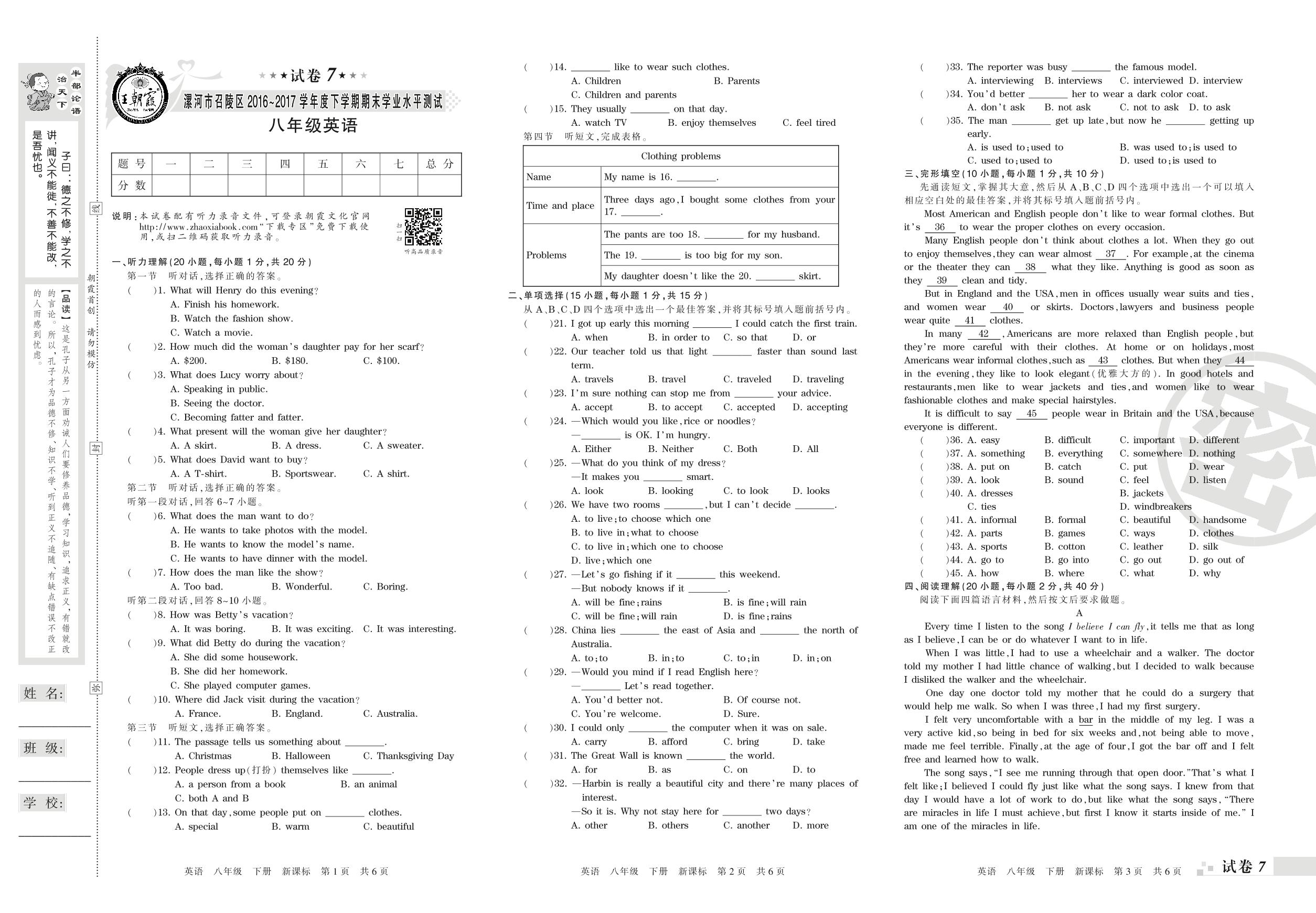 2016-2017学年第二学期漯河市召陵区八年级英语试卷(新课版)【7】