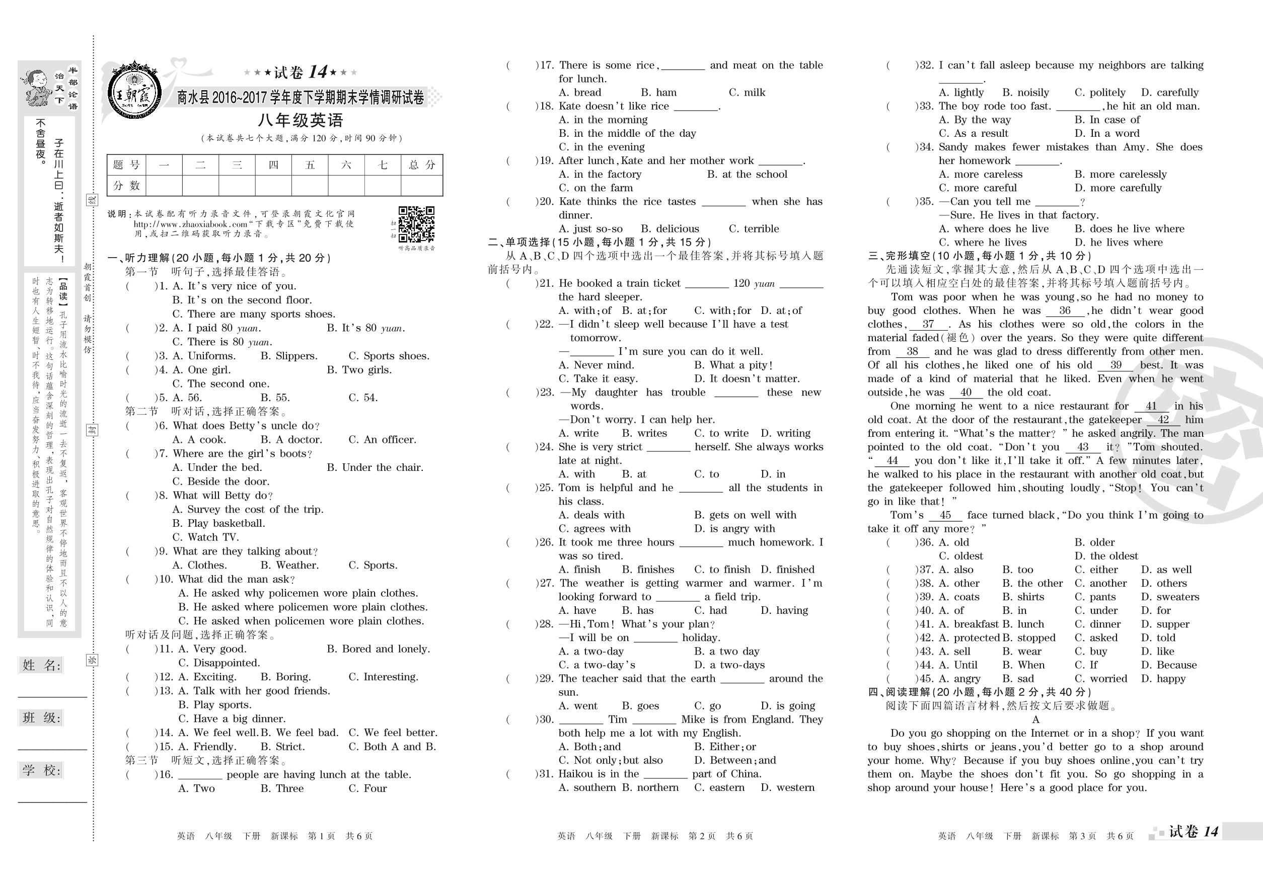 2016-2017学年第二学期周口市商水县八年级英语试卷(新课版)【14】