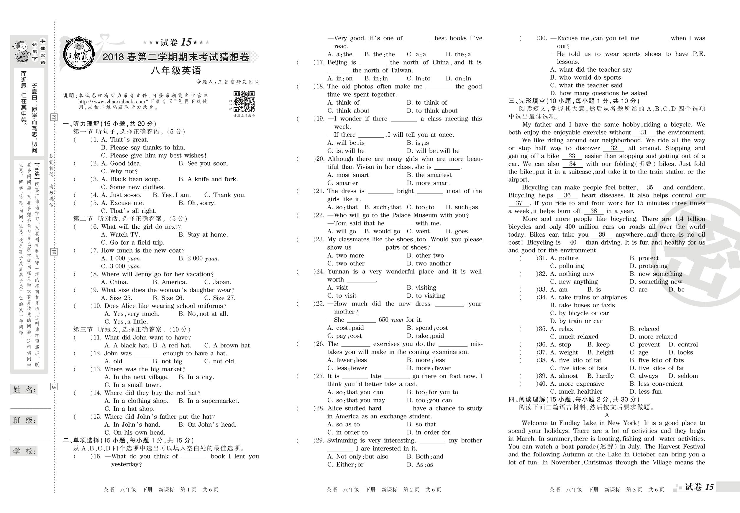 2017-2018学年第二学期期末考试猜想卷八年级下册英语(新课版)【15】