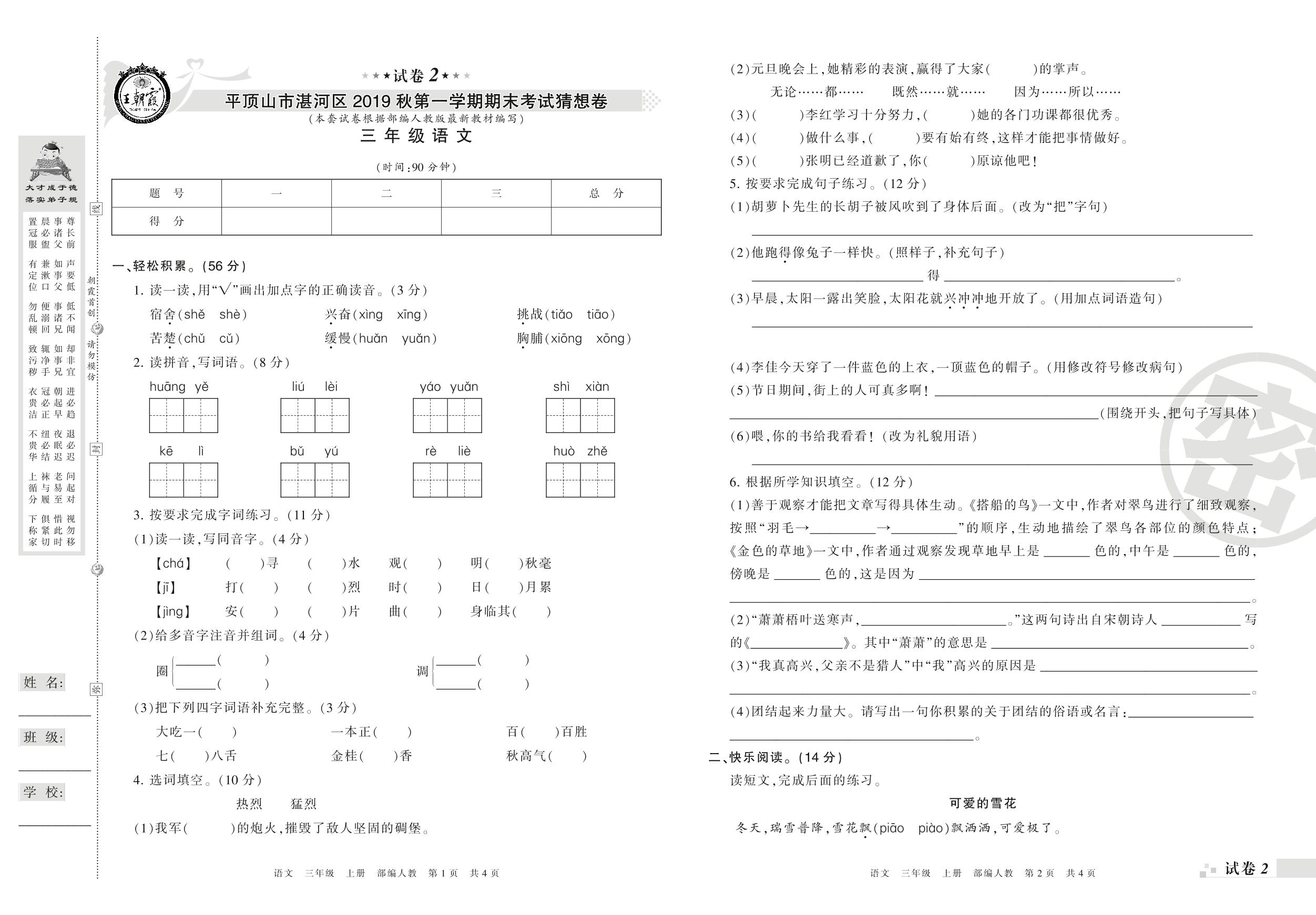 2018-2019学年第一学期平顶山市湛河区猜想卷三年级语文试卷(人教版)【2】
