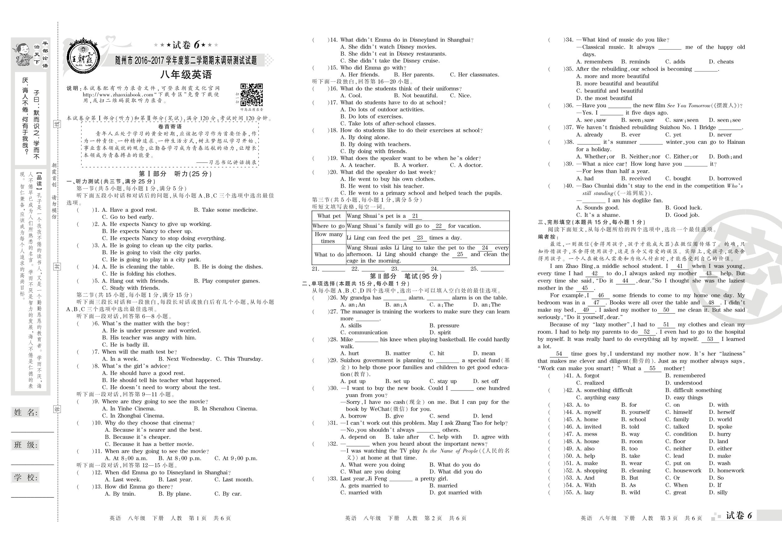 2016-2017学年第二学期随州市八年级英语试卷(人教版)【6】