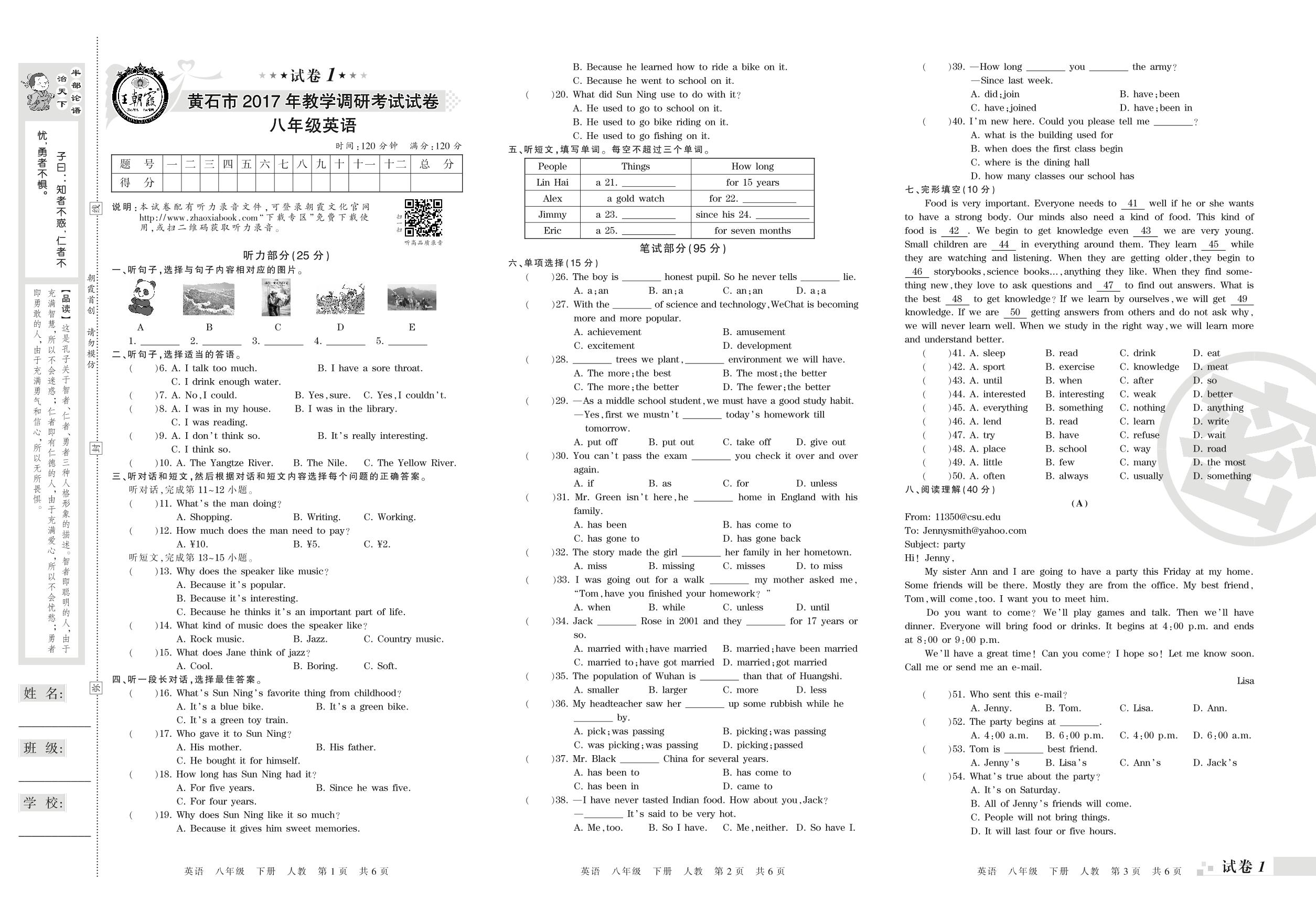 2016-2017学年第二学期黄石市八年级英语试卷(人教版)【1】