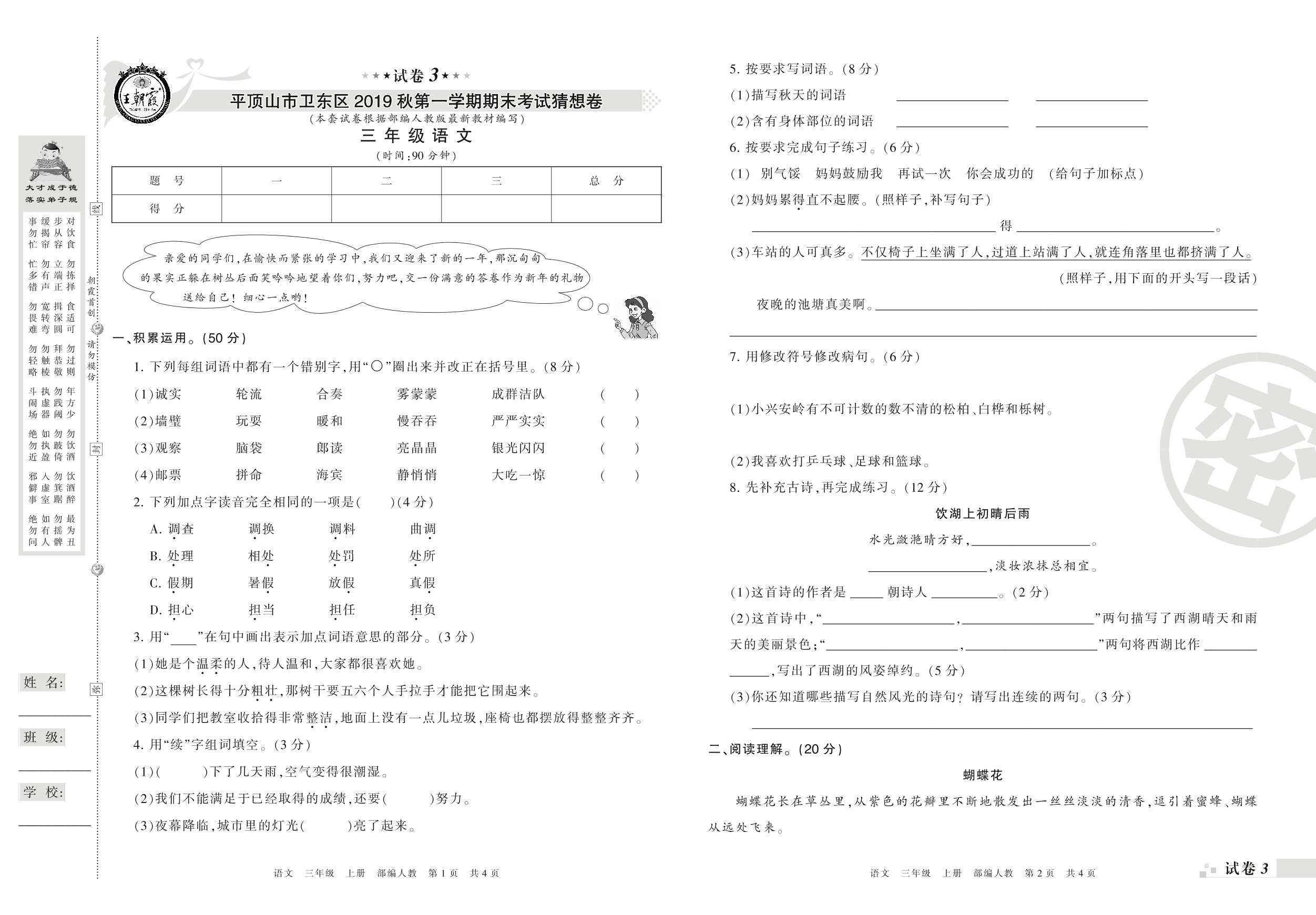 2018-2019学年第一学期平顶山市卫东区猜想卷三年级语文试卷(人教版)【3】
