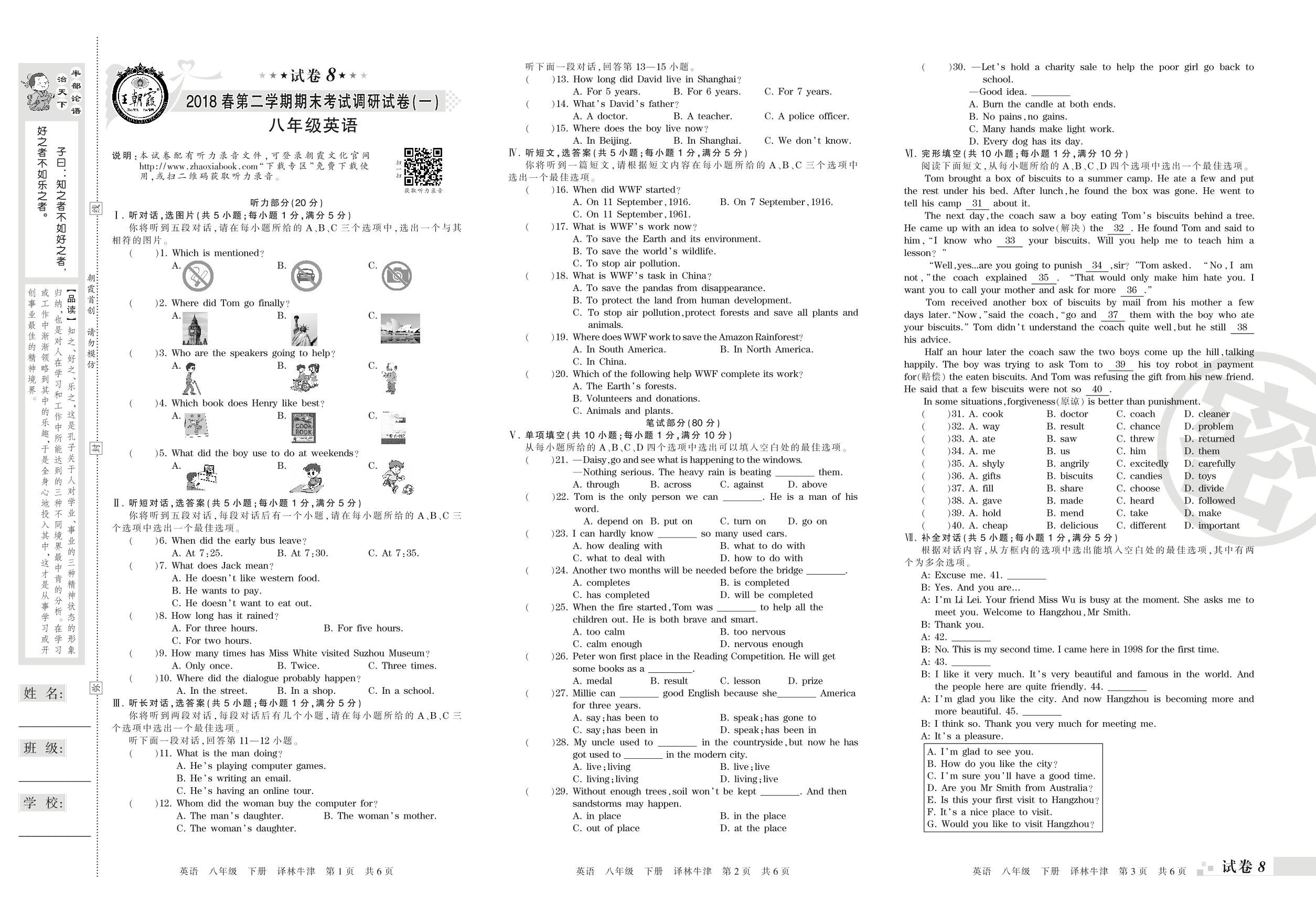 2017-2018学年第二学期期末考试调研试卷(一)八年级英语(译林版)【8】