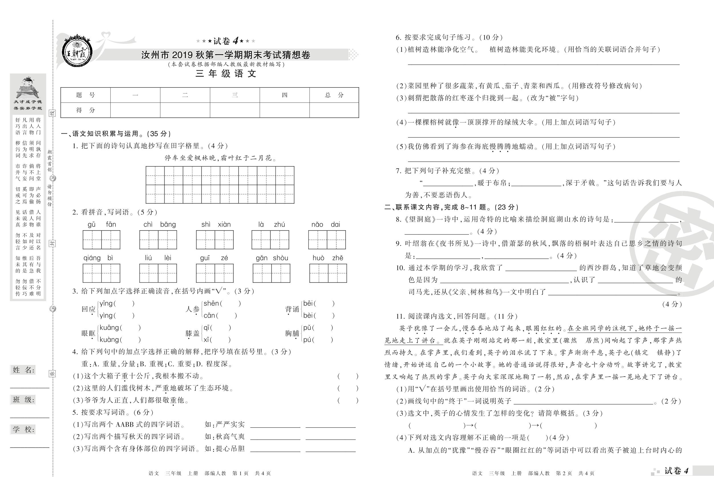 2018-2019学年第一学期汝州市猜想卷三年级语文试卷(人教版)【4】