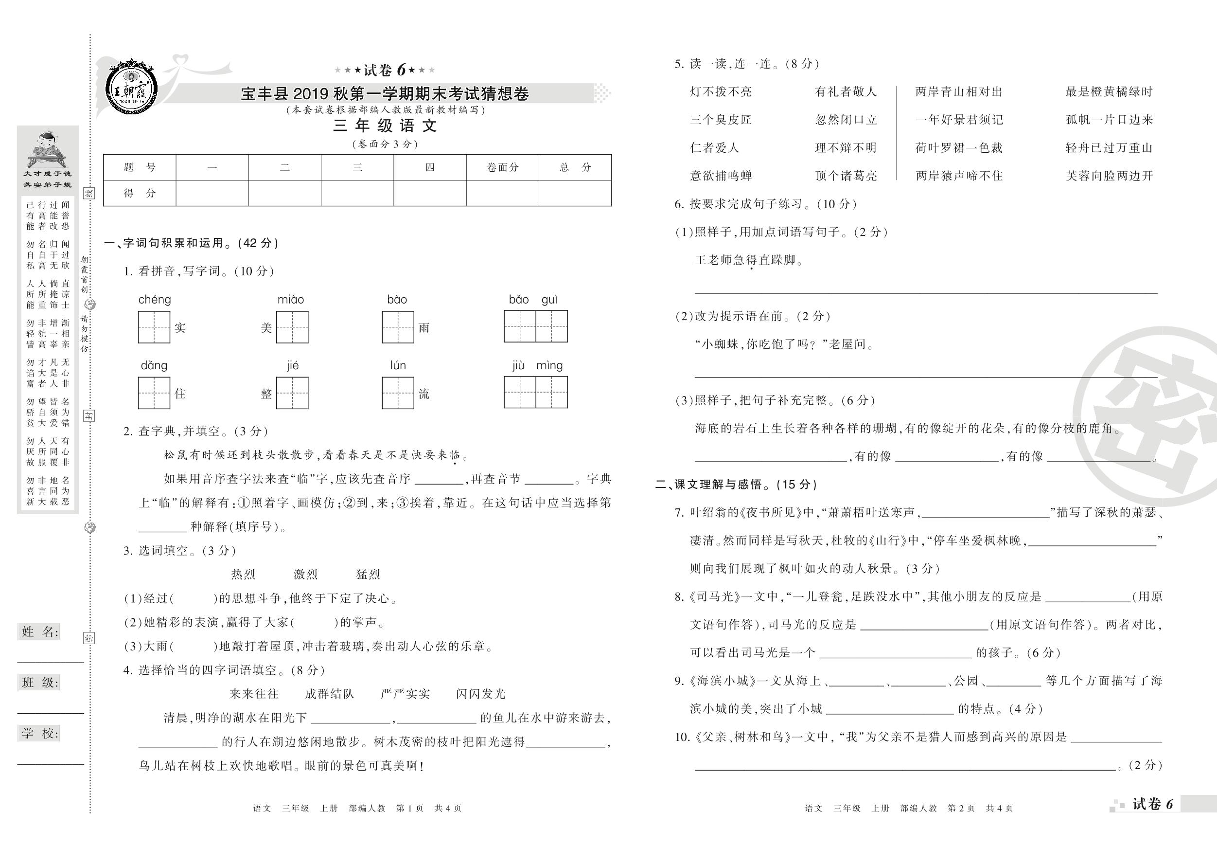 2018-2019学年第一学期平顶山市宝丰县猜想卷三年级语文试卷(人教版)【6】