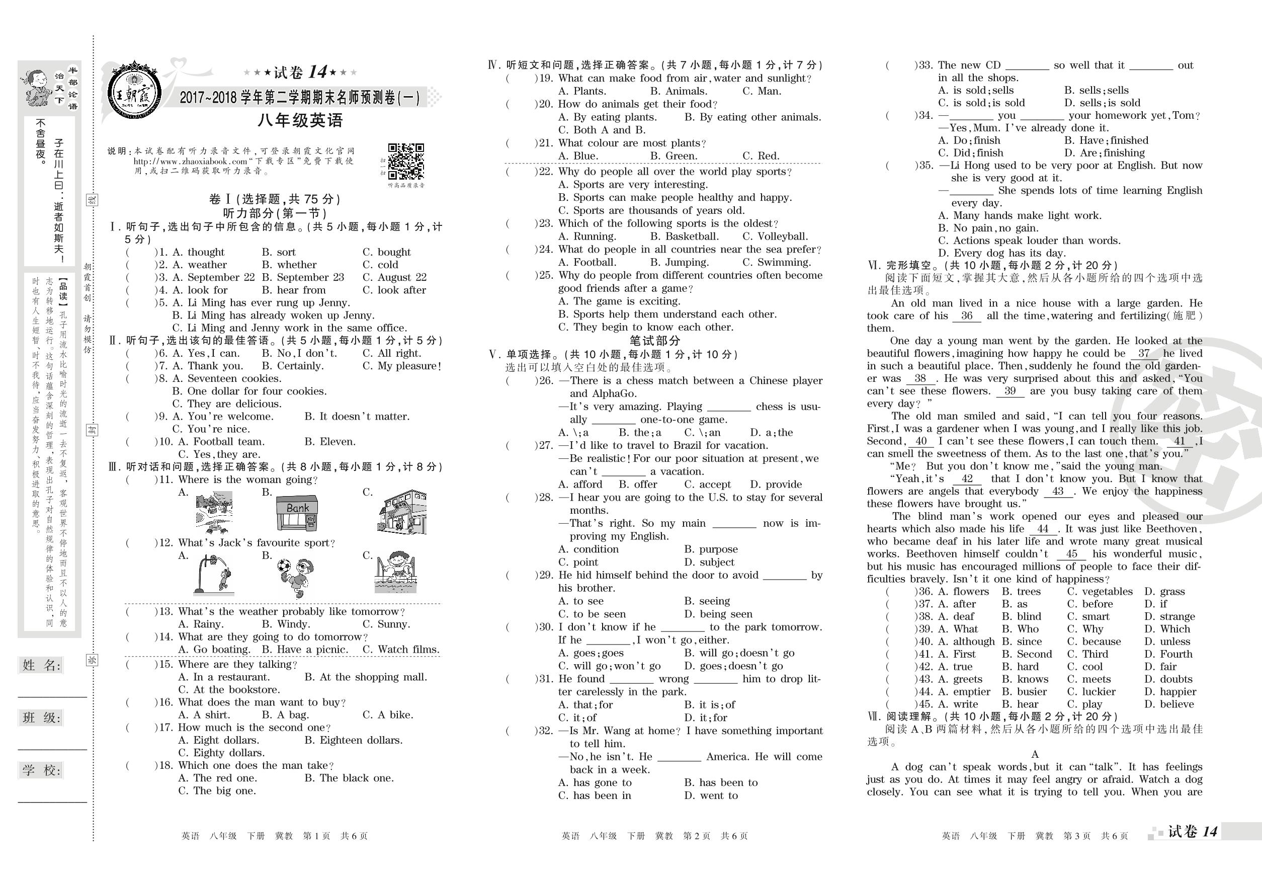 2017-2018学年第二学期期末预测卷(一)八年级英语(冀教版)【14】