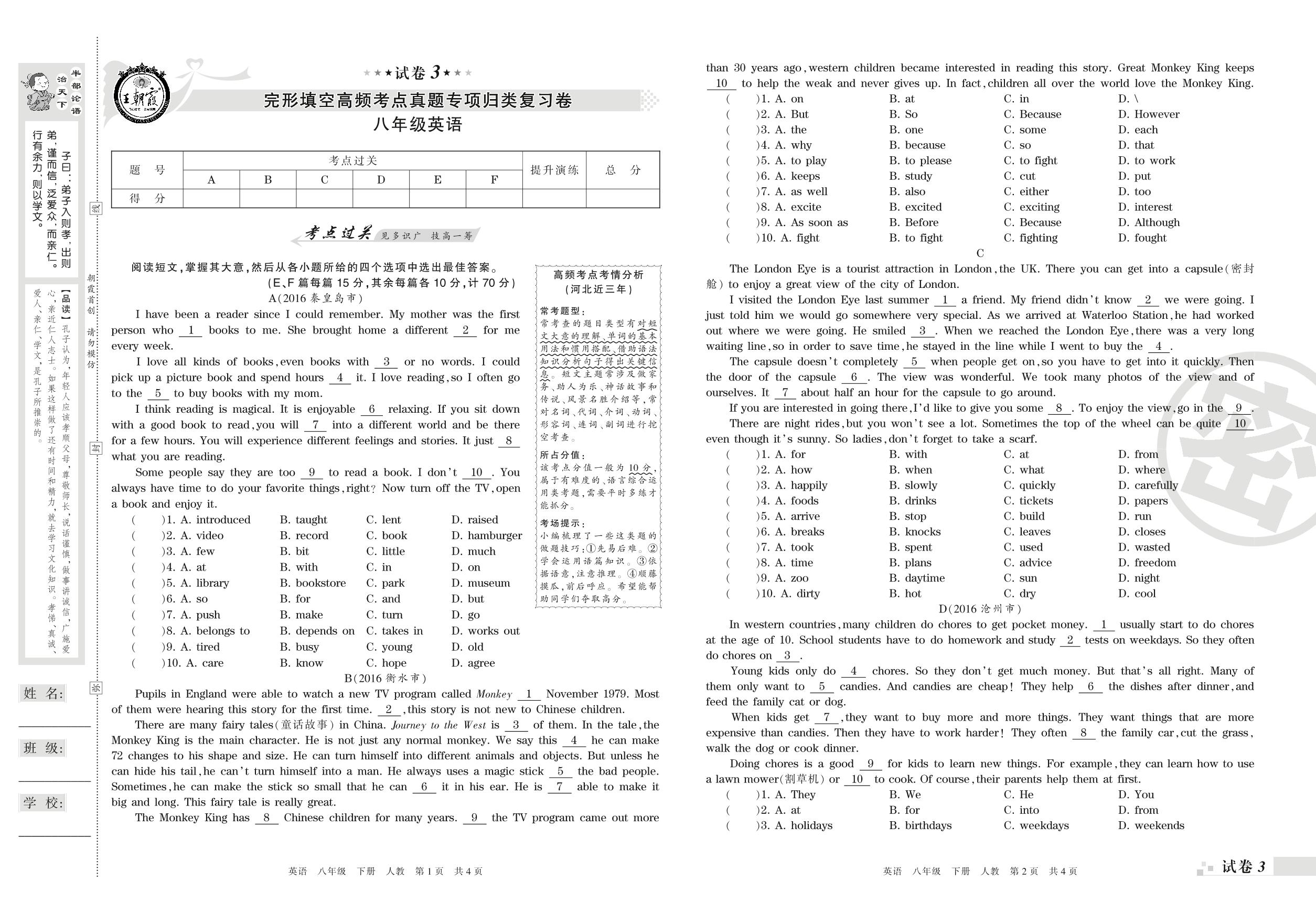王朝霞期末专项卷——完形填空高频考点真题专项归类复习卷八年级下册英语(人教版)_R210809134732【3】