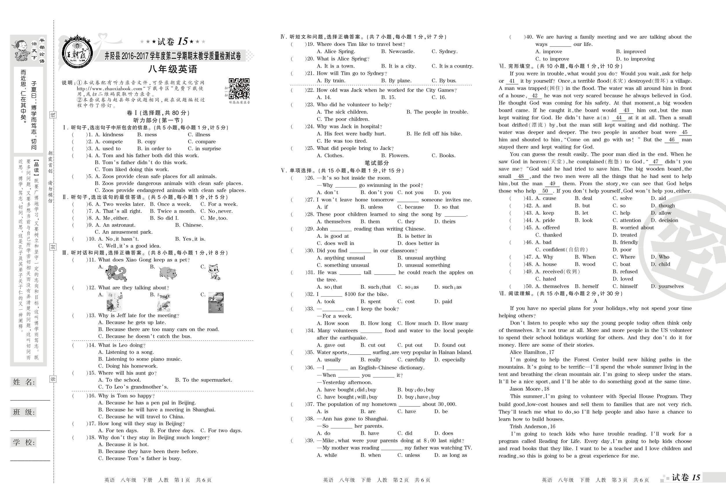 2016-2017学年第二学期石家庄市井陉县八年级英语试卷(人教版)【15】