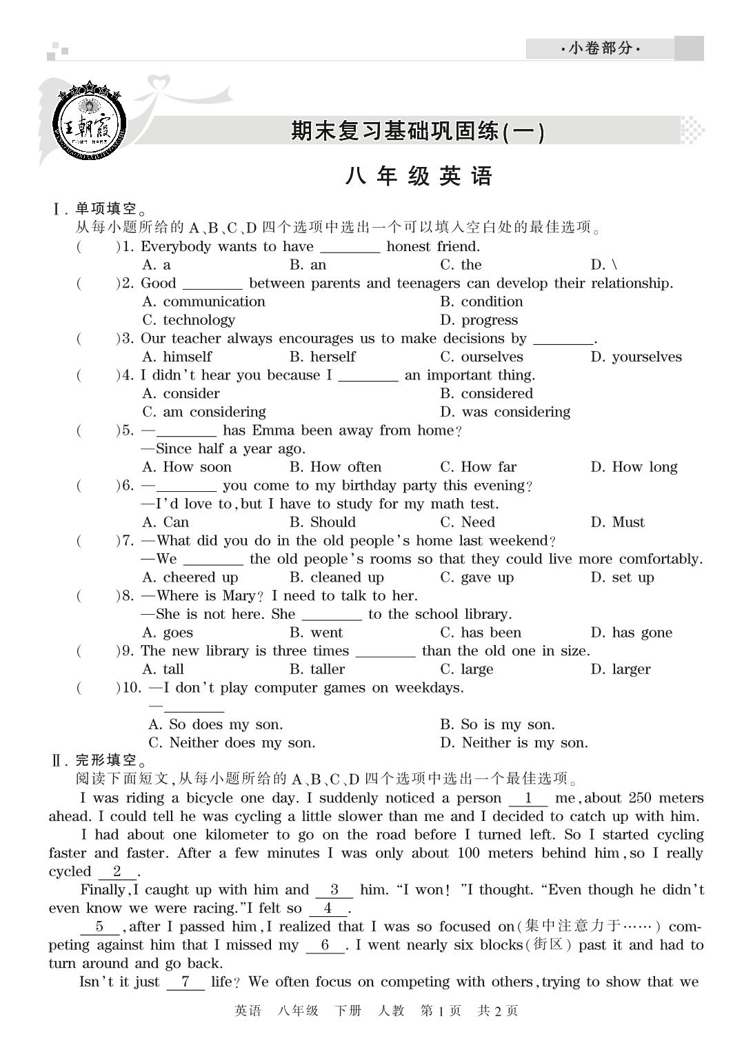 王朝霞期末小卷——期末复习基础巩固练(一)八年级下册英语(人教版)【0】