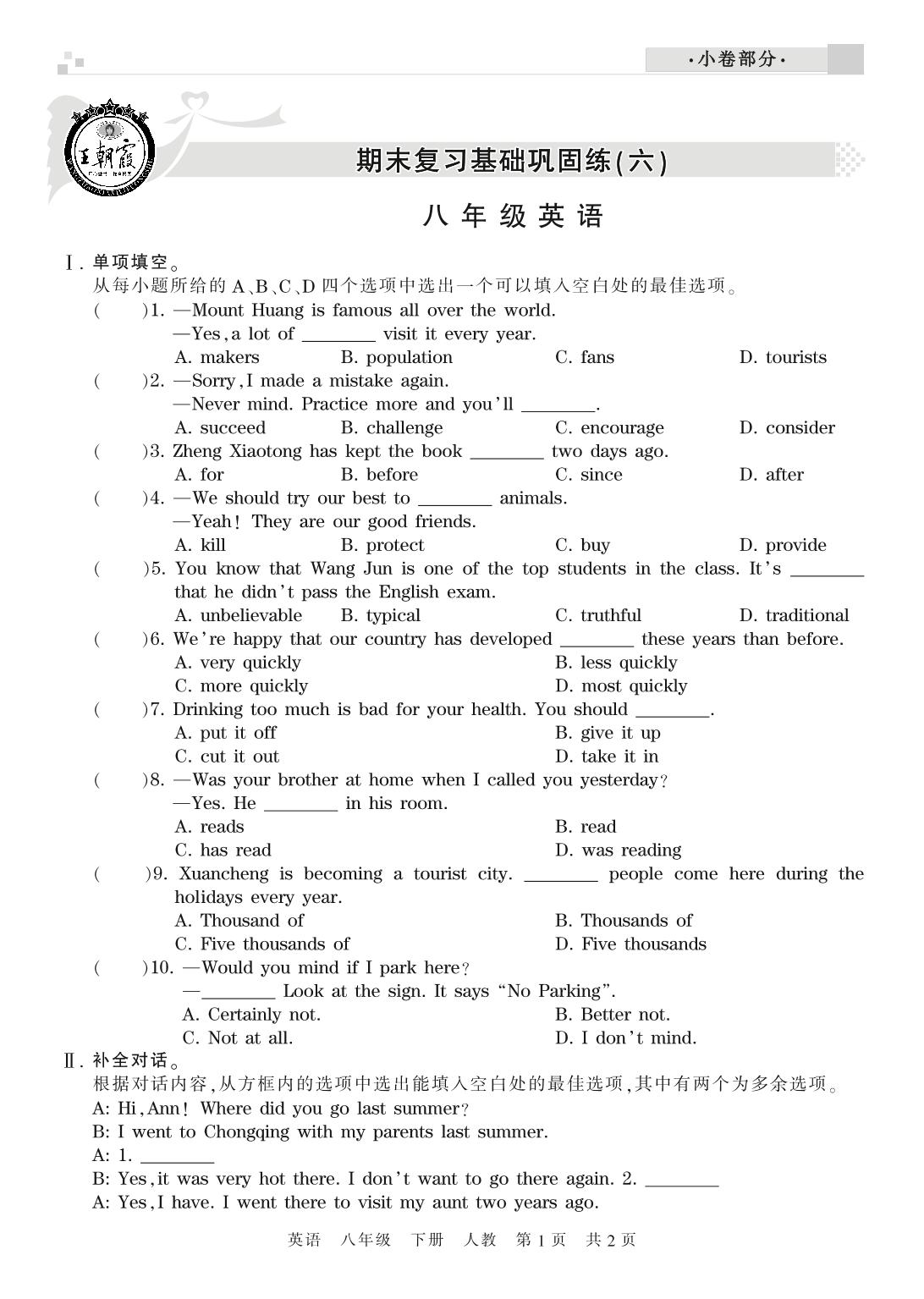 王朝霞期末小卷——期末复习基础巩固练(六)八年级下册英语(人教版)【0】