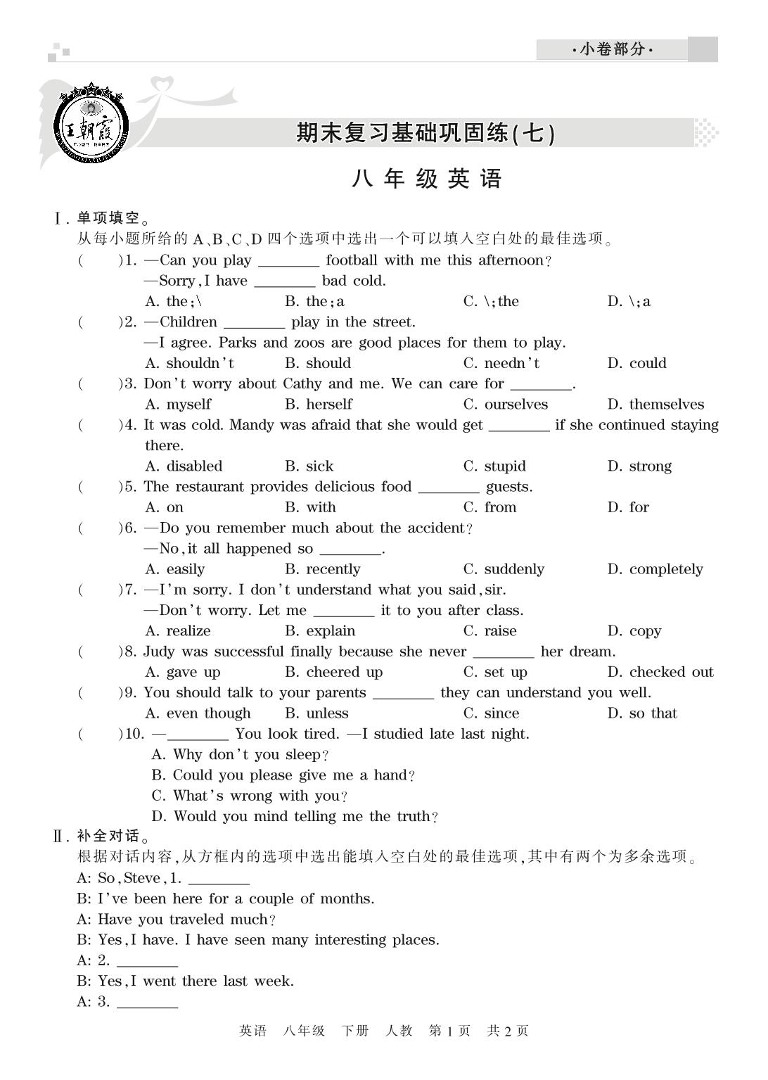 王朝霞期末小卷——期末复习基础巩固练(七)八年级下册英语(人教版)【0】