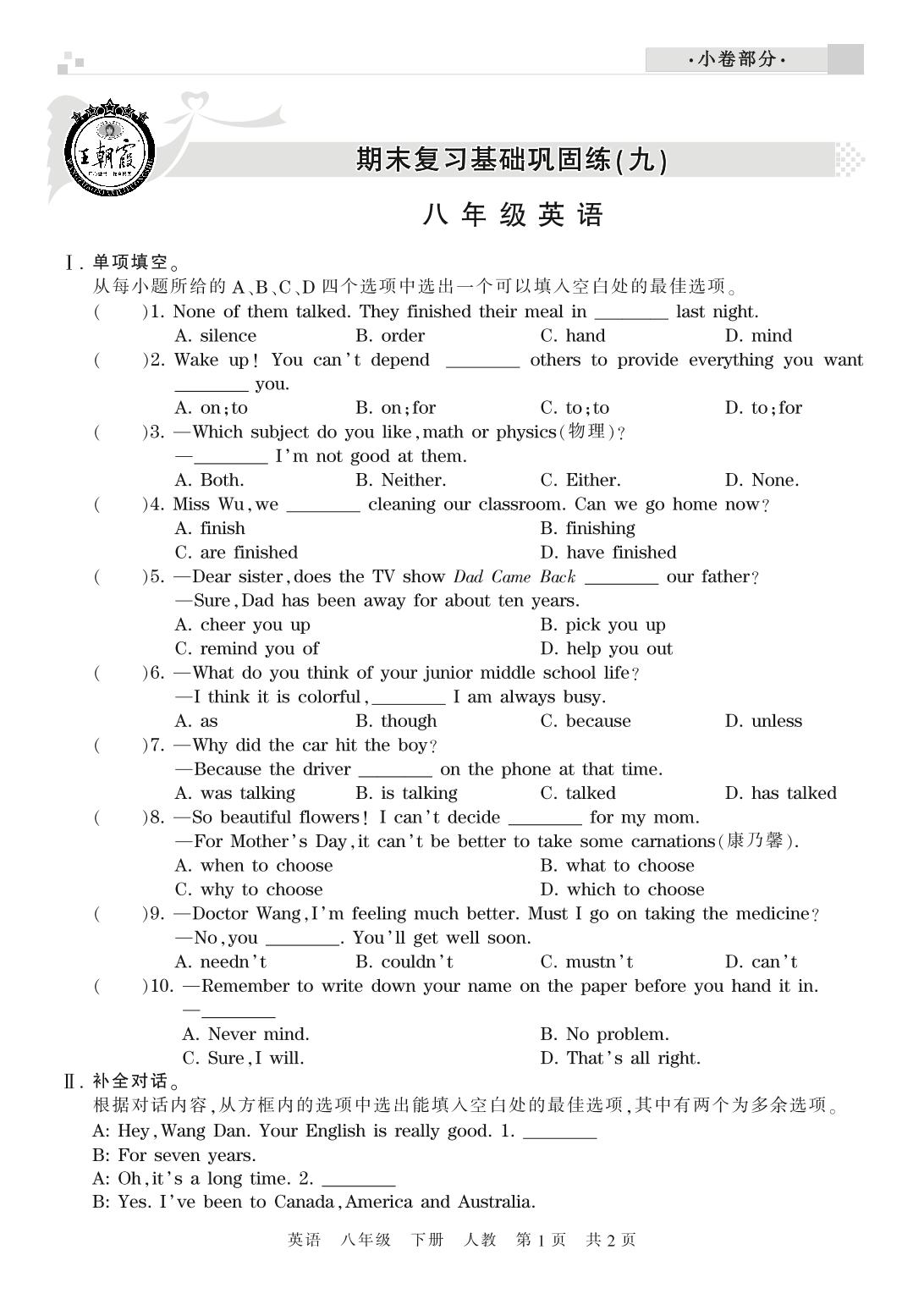 王朝霞期末小卷——期末复习基础巩固练(九)八年级下册英语(人教版)【0】