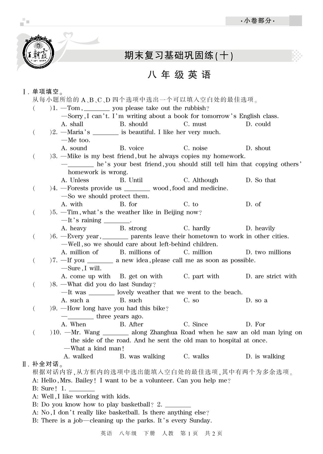 王朝霞期末小卷——期末复习基础巩固练(十)八年级下册英语(人教版)【0】