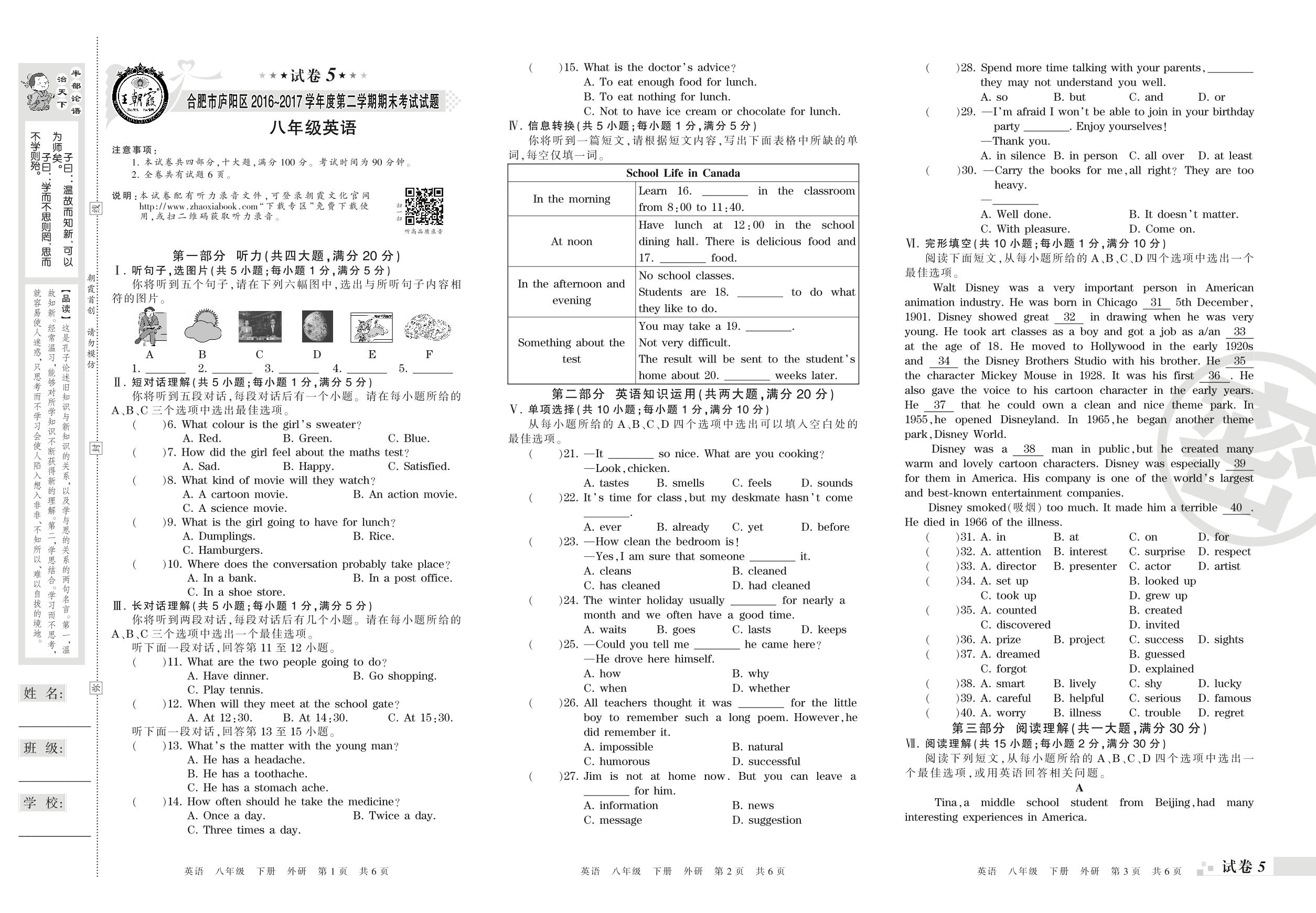 2016-2017学年第二学期合肥市庐阳区八年级英语试卷(外研版)【5】
